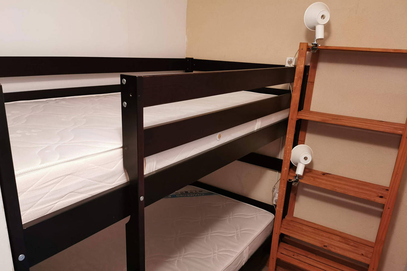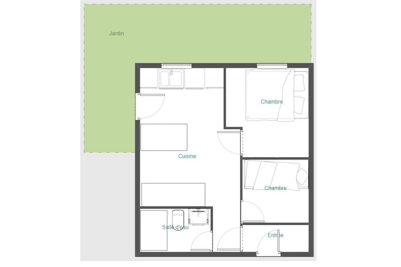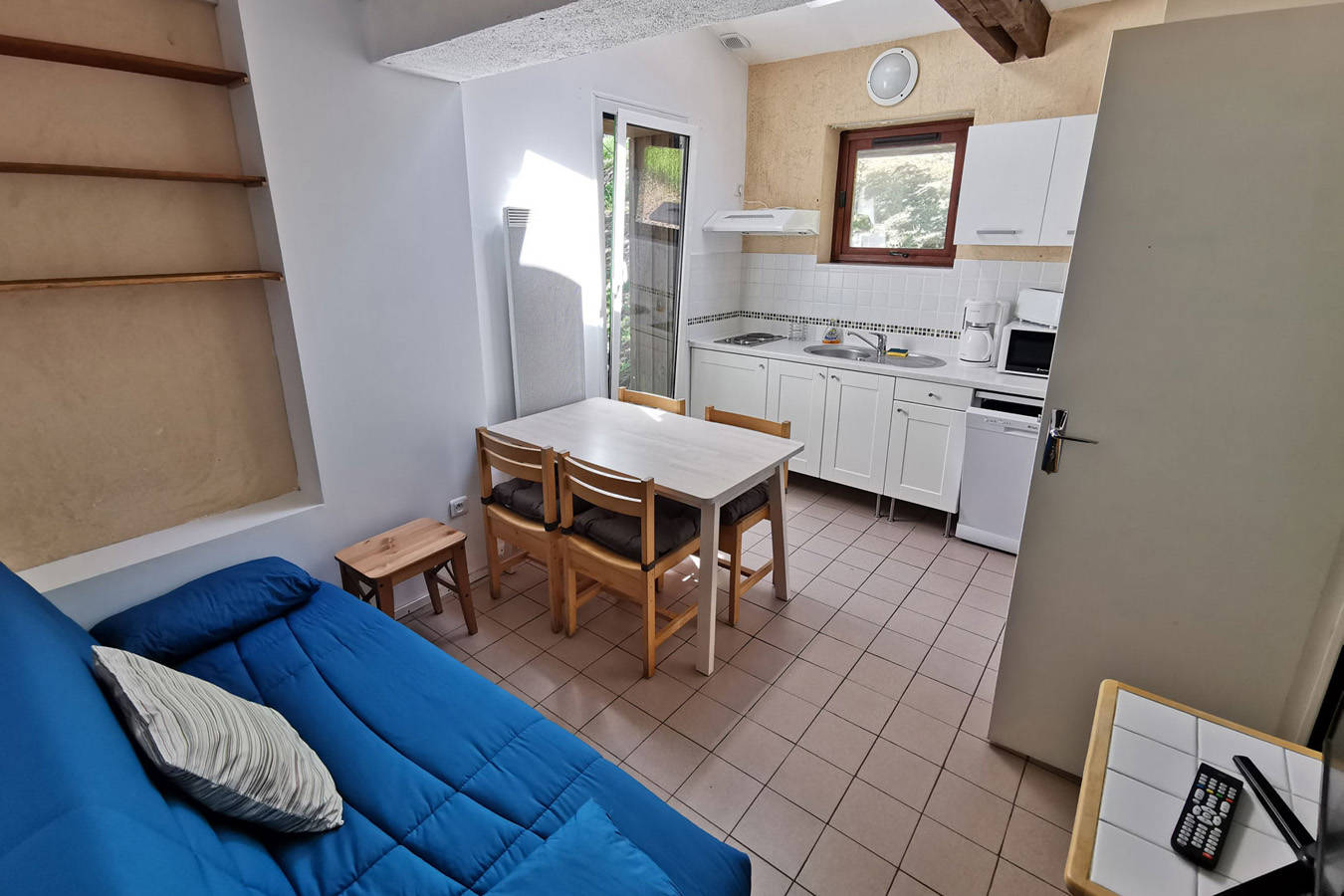 L’appartement comprend 2 chambres, une salle d’eau/WC, un coin salon avec son lit d’appoint et possède une cuisine avec plaques électriques, un four à micro-onde et un réfrigérateur.