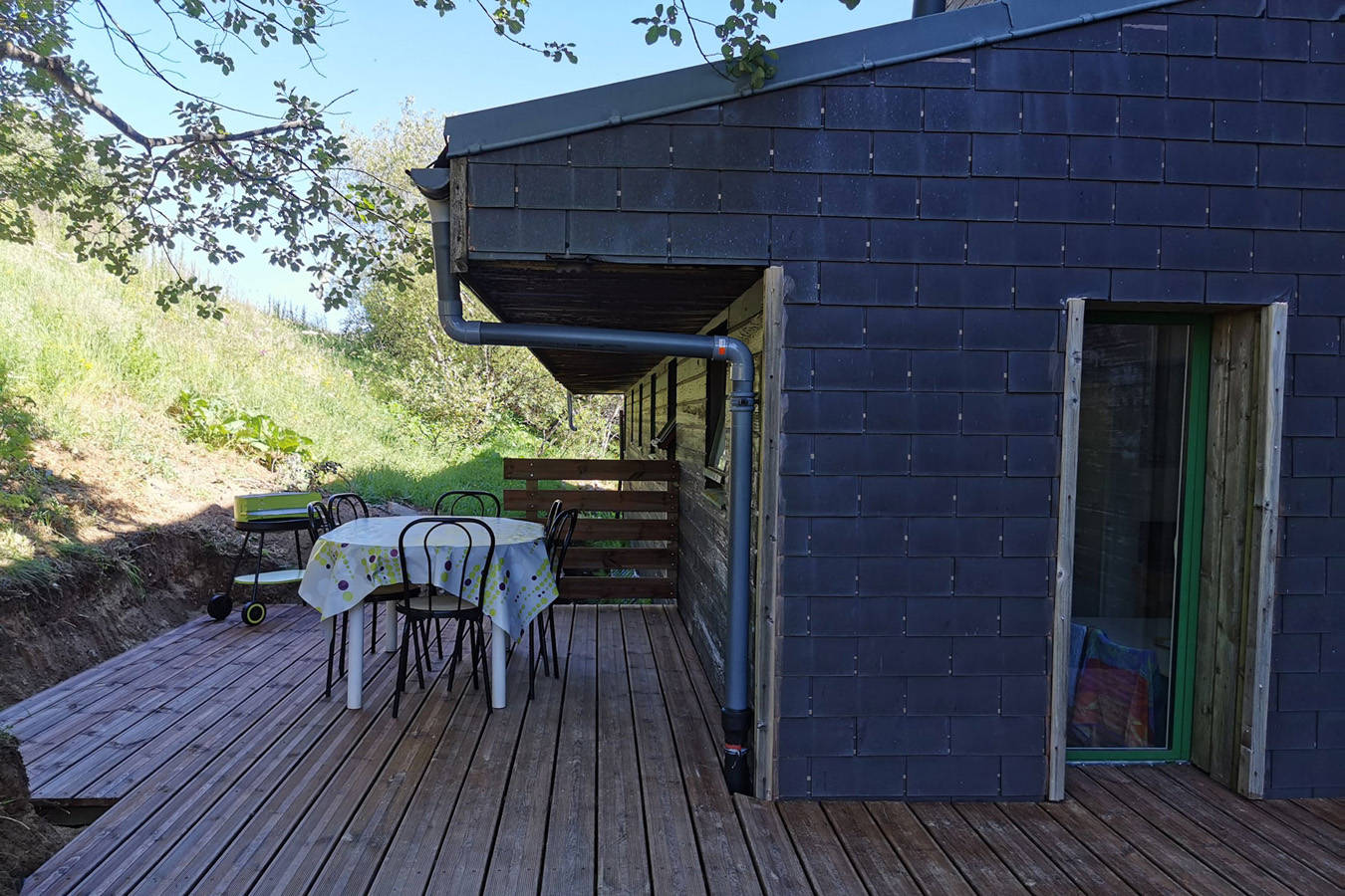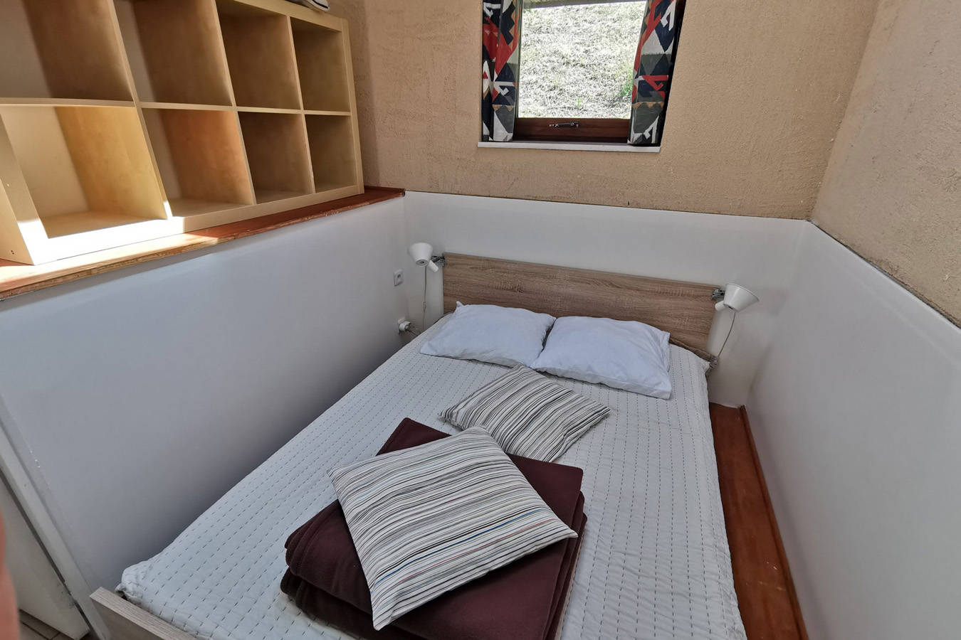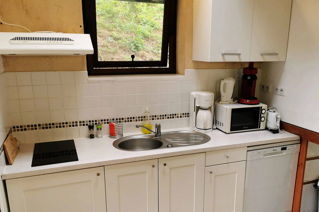 L’appartement comprend 2 chambres, une salle d’eau/WC, un coin salon avec son lit d’appoint et possède une cuisine avec plaques électriques, un four à micro-onde et un réfrigérateur.