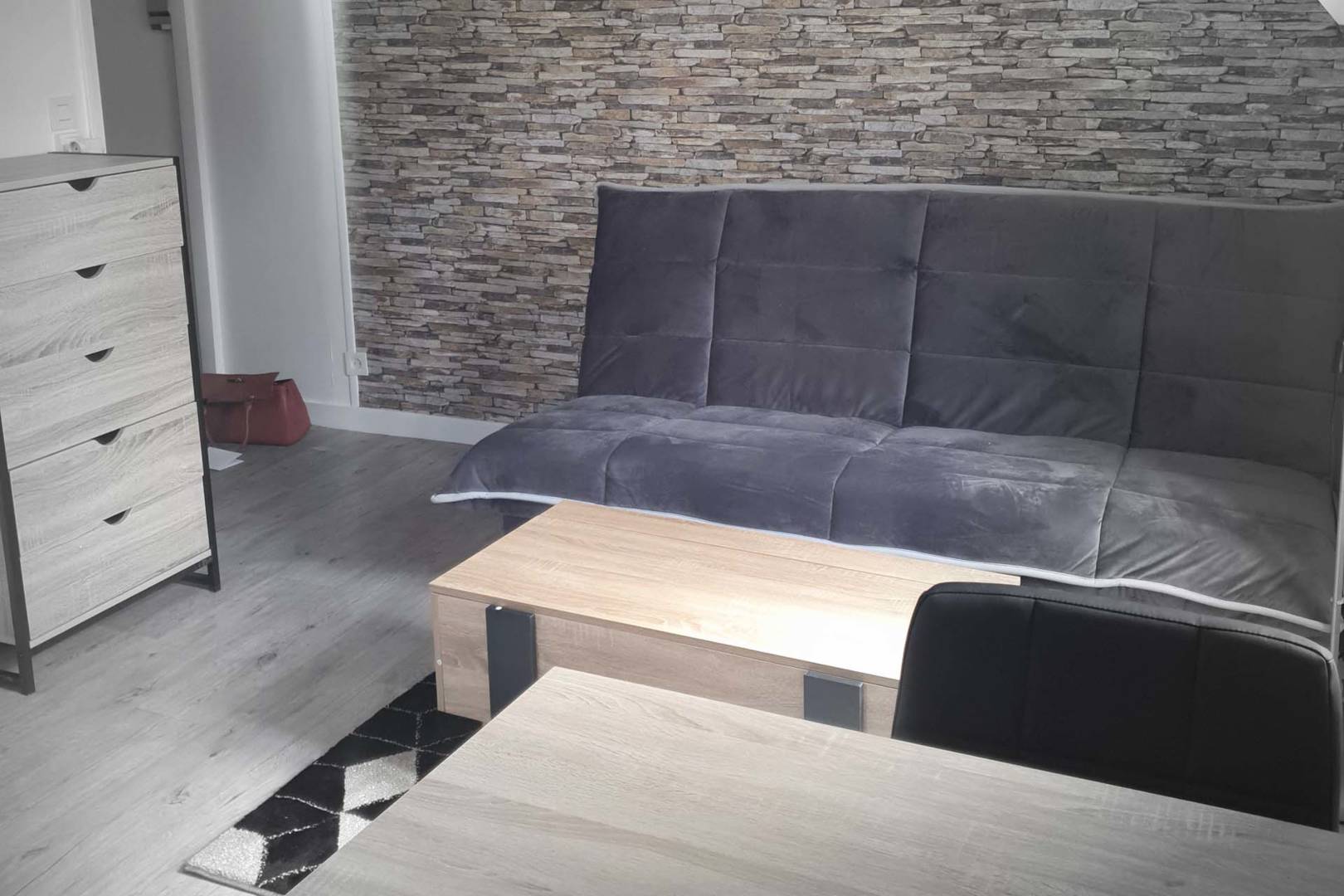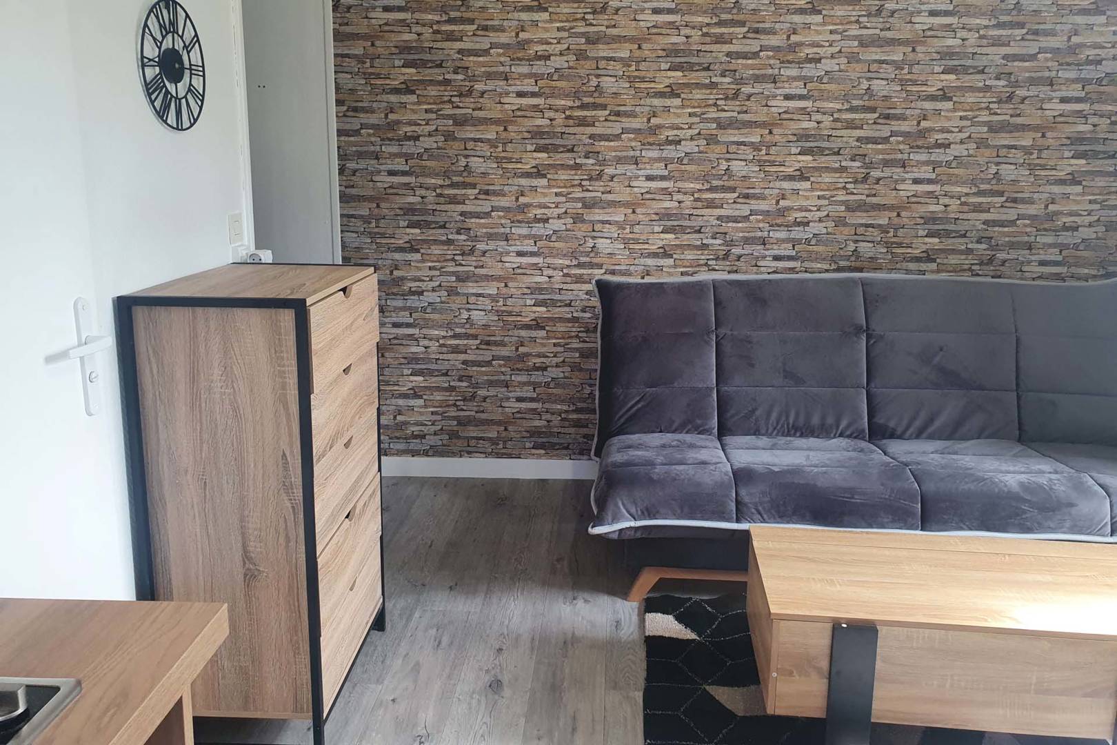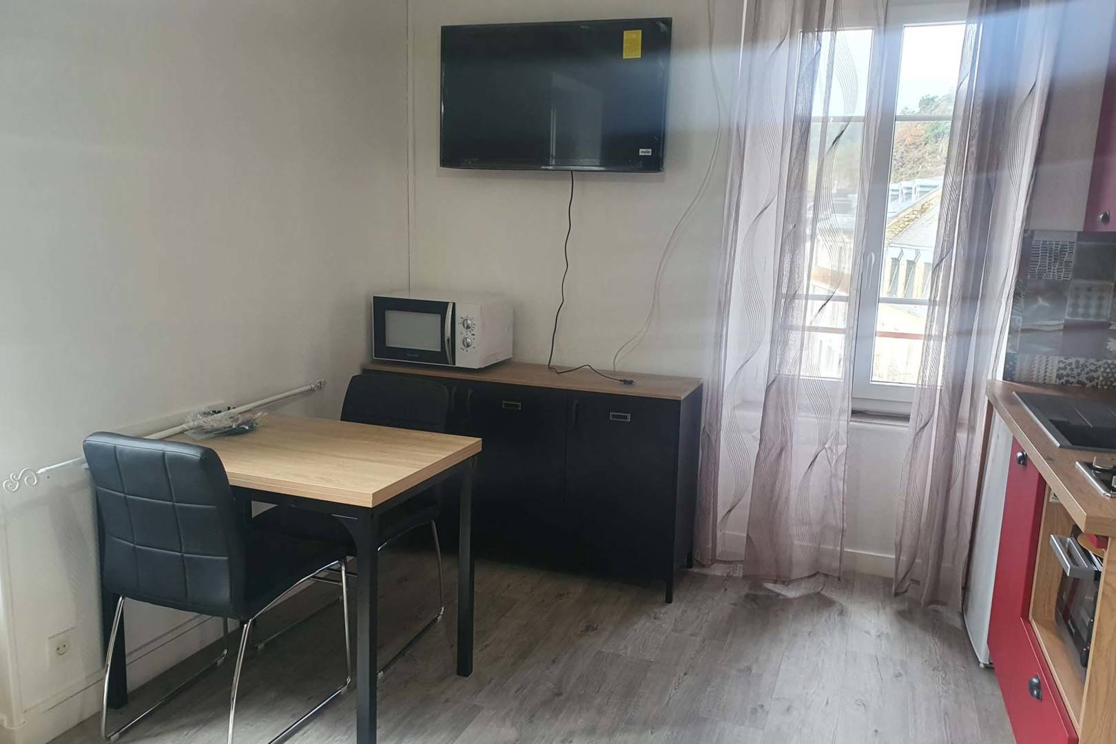 Kitchenette, coin repas et canapé lit.