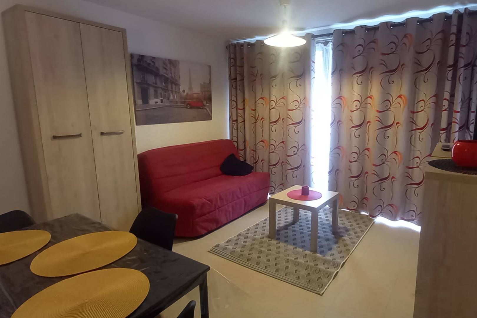 Entièrement meublé à neuf comprenant : hall d’entrée avec placard, salle à manger / séjour lumineux ouvrant sur un balcon avec salon de jardin, cuisine équipée, grande chambre avec un lit de 140 cm et une grande armoire avec penderie, salle(…)