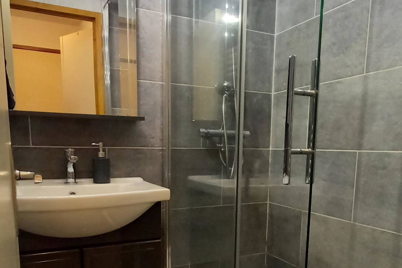 Salle d’eau : un meuble vasque avec miroir, douche, sèche-serviette, sèche-cheveux (linge de toilette non fourni).