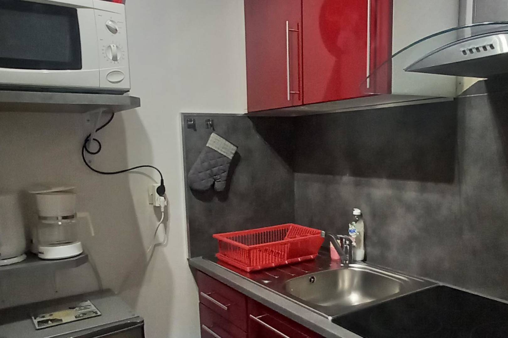 Cuisine : plaque de cuisson avec hotte aspirante, four traditionnel, four micro-ondes, réfrigérateur, bouilloire, grille-pain, cafetière, vaisselle, appareil à raclette…