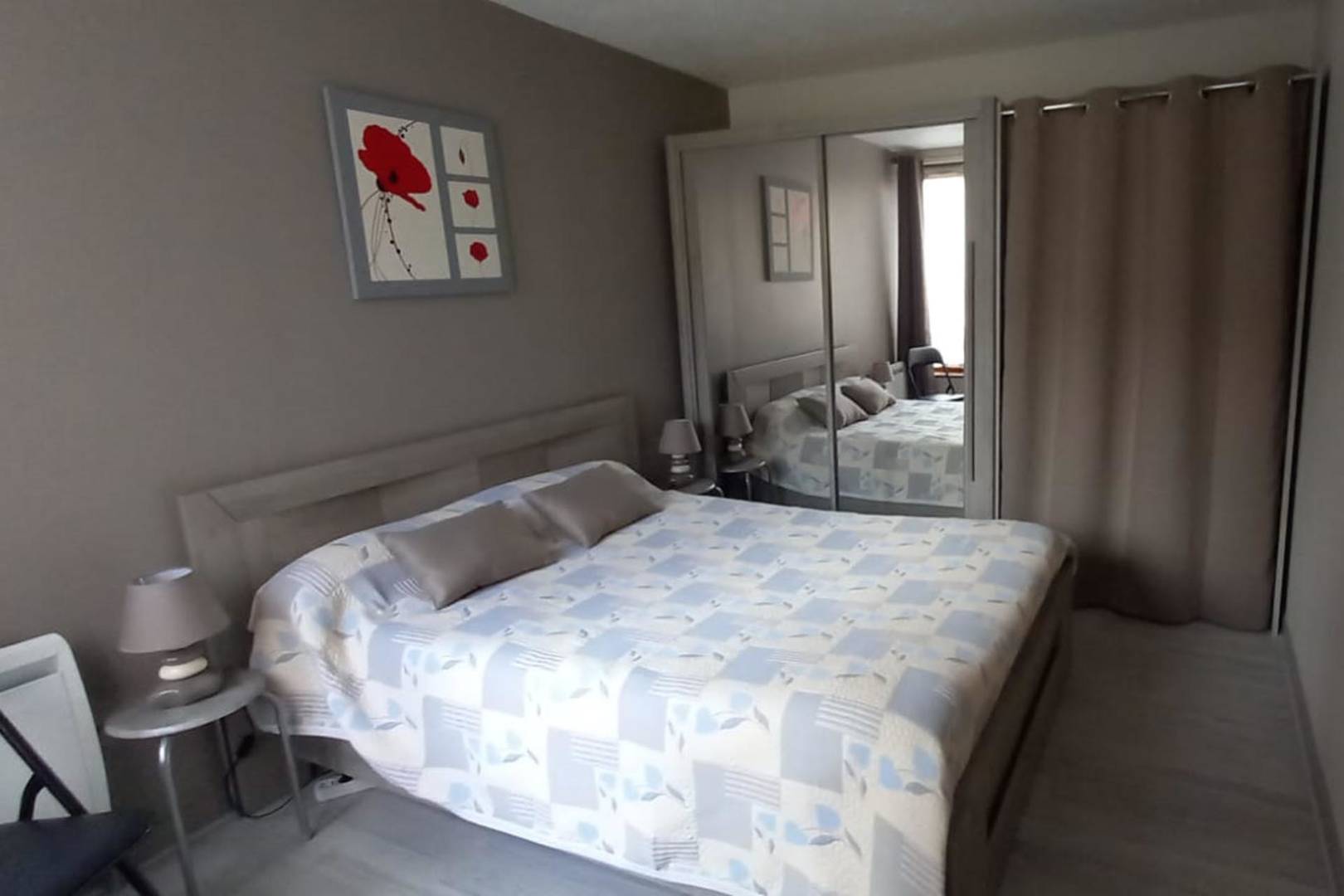 Chambre : lit 140 cm, lit d’appoint 90 cm, grande armoire avec penderie, porte-valise, lampes de chevet, couvertures, oreillers et traversins (linge de lit non fourni).