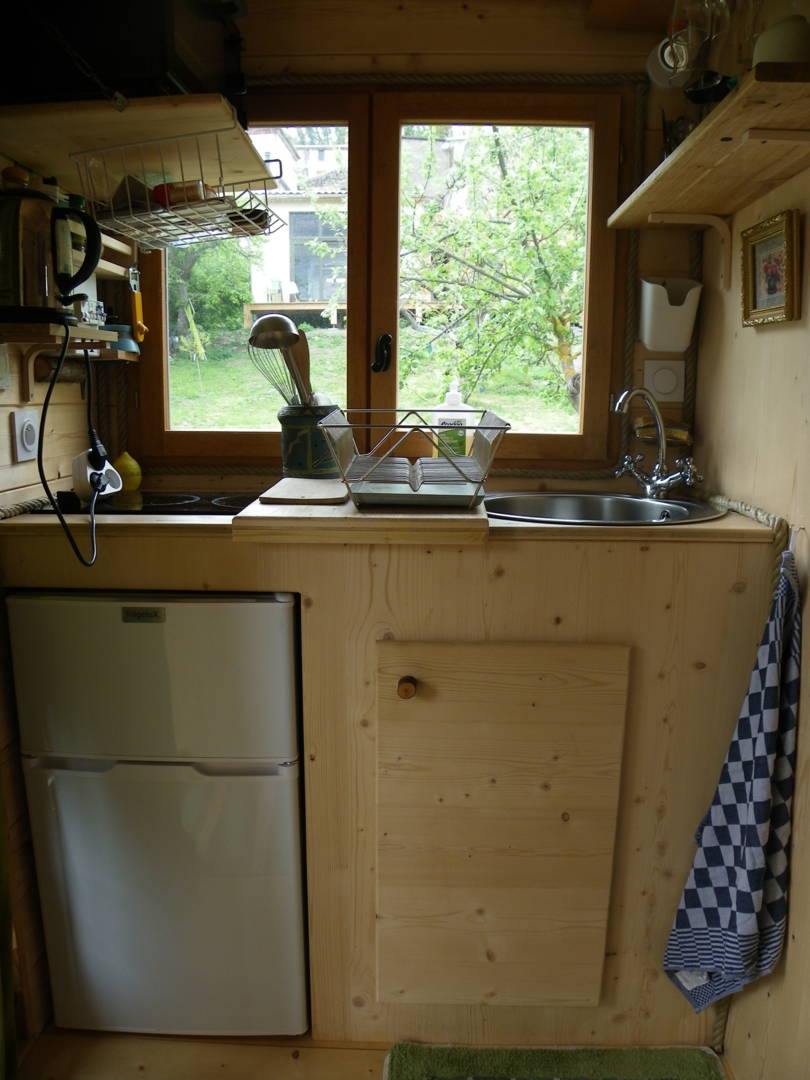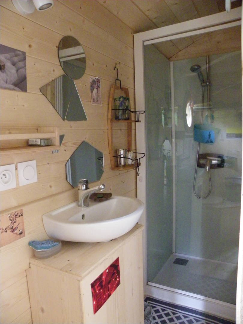 La roulotte est un petit espace de 2,20m de large par 5m de long. La salle d’eau se dessine dans un espace de 80cm de large ( taille de la douche tout à fait confortable), sur 2,20m de long. Elle est parfaitement aménagée pour y vivre convenablement.