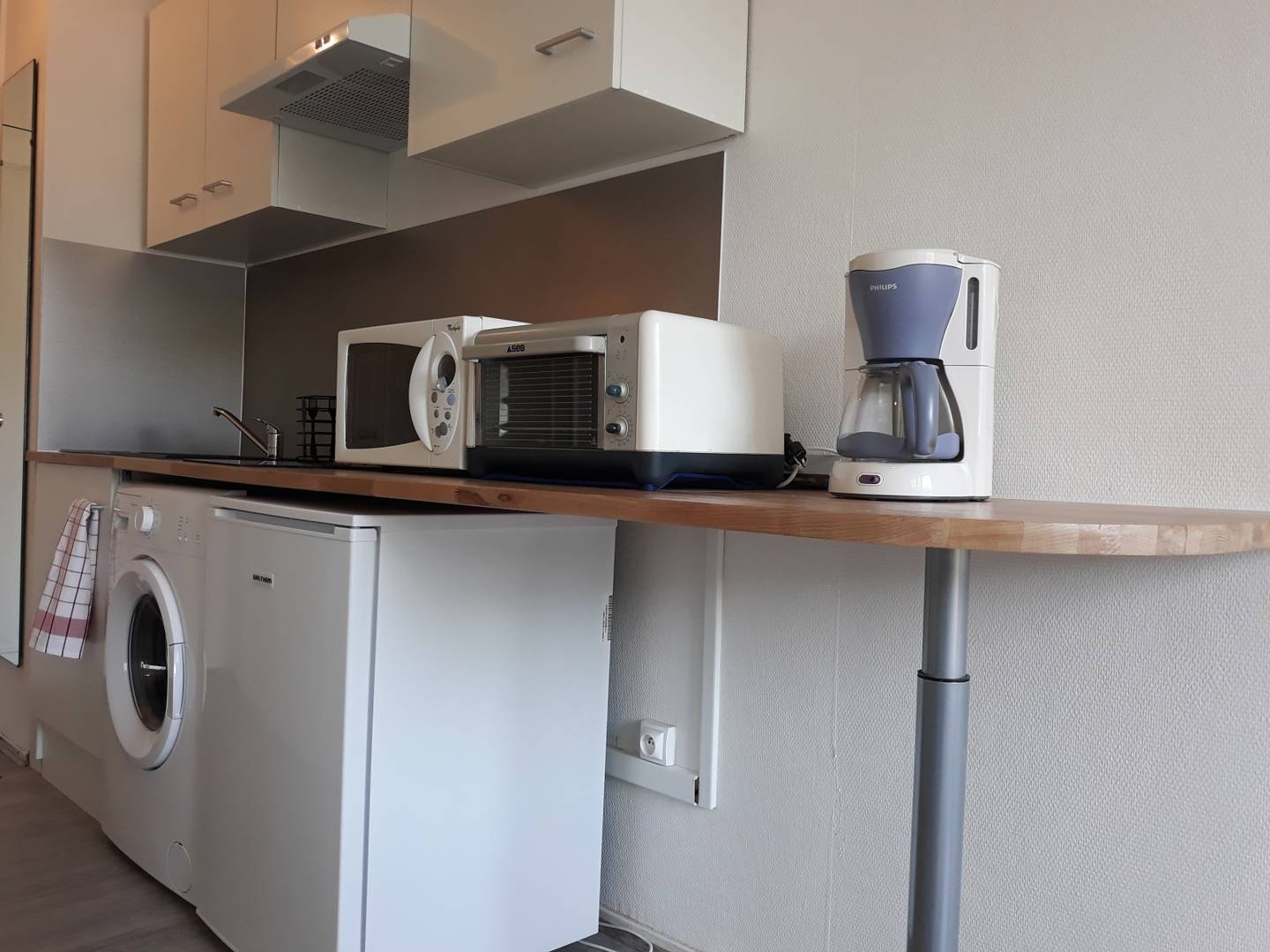 un coin kitchenette entièrement équipé (plaque à induction, frigo, micro-onde, mini four, bouilloire et cafetière Senseo, couverts) ;