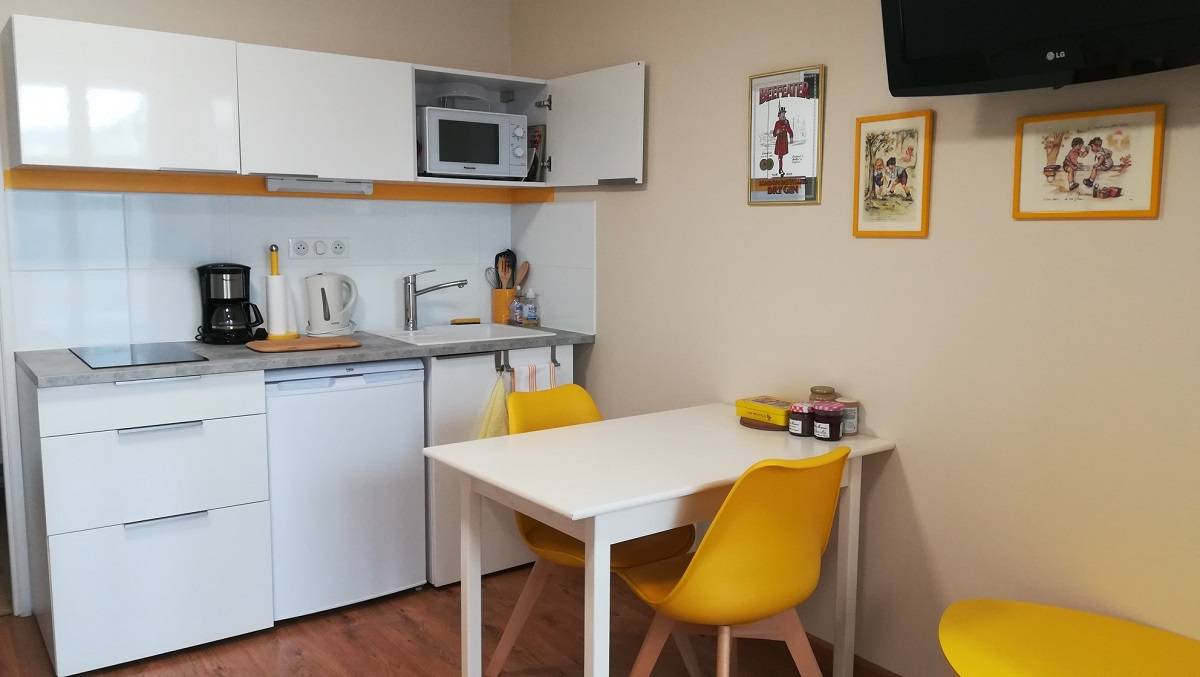 Pièce principale exposée Ouest avec vue sur le jardin. TV 80cm, WIFI, 4G, radio. Kitchenette équipée d’une double plaque vitrocéramique, frigo, micro-ondes grill, cafetière, bouilloire, grille-pain, autocuiseur clipsominut, vaisselle et ustensiles de cuisine. Lit de 140×190 avec un confortable matelas prêt à votre arrivée. Linge de lit, de toilette et(…)
