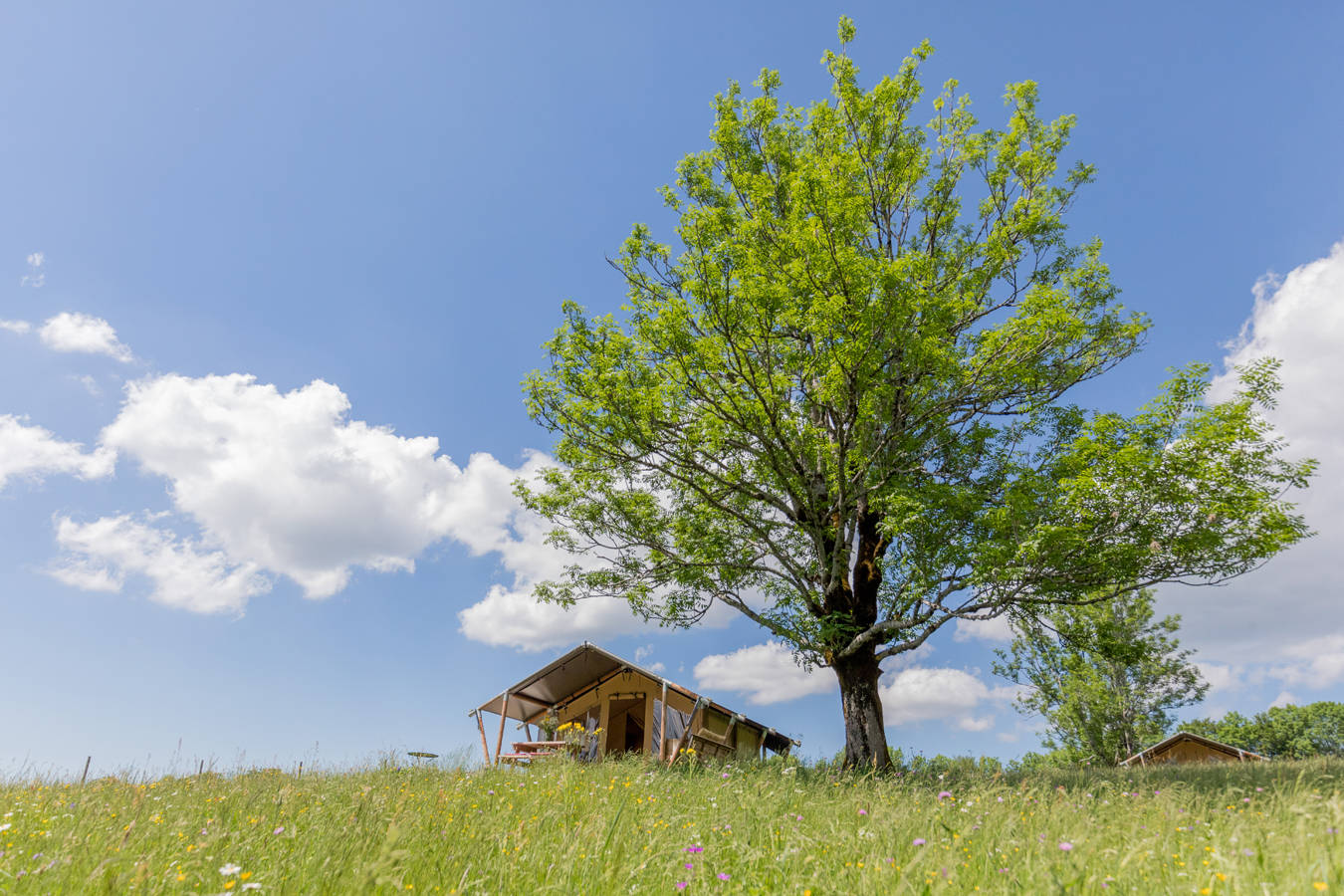 De mi mai à fin septembre : 2 tentes lodges pour 6 personnes avec 2 chambres, toilettes sèches, cuisine extérieure, et accès à une salle de bain partagée.