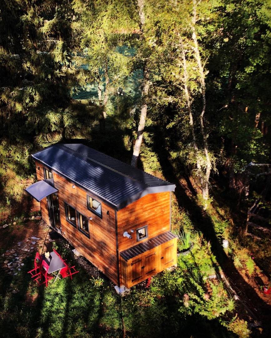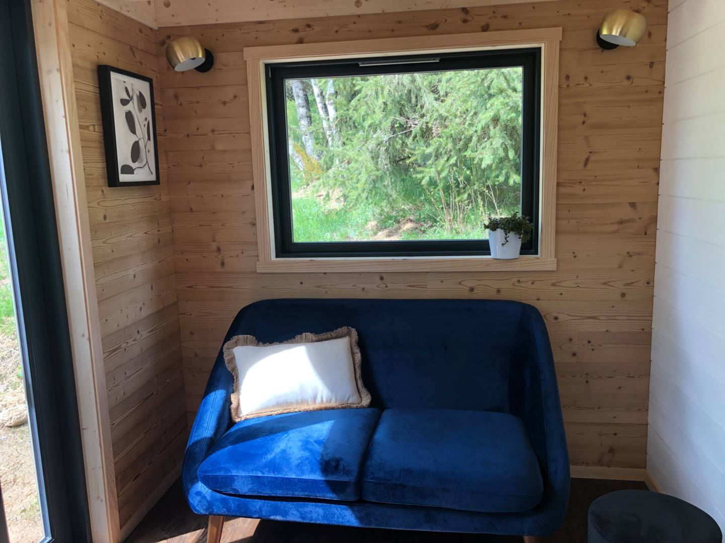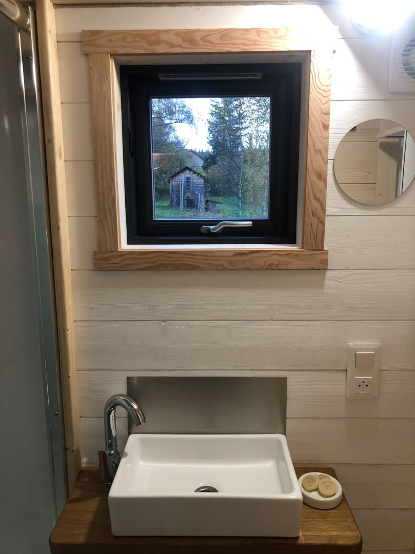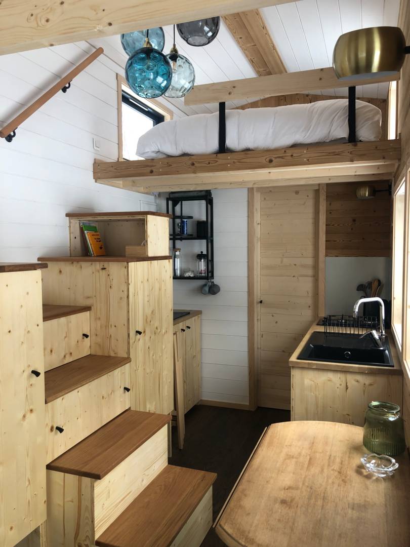 Elle est composée de deux espaces chambres (2 lits de 140x 190) qui se font face en mezzanine sans séparation, d’un coin salon, d’une kitchenette et d’une salle d’eau avec douche, lavabo et toilettes sèches.
