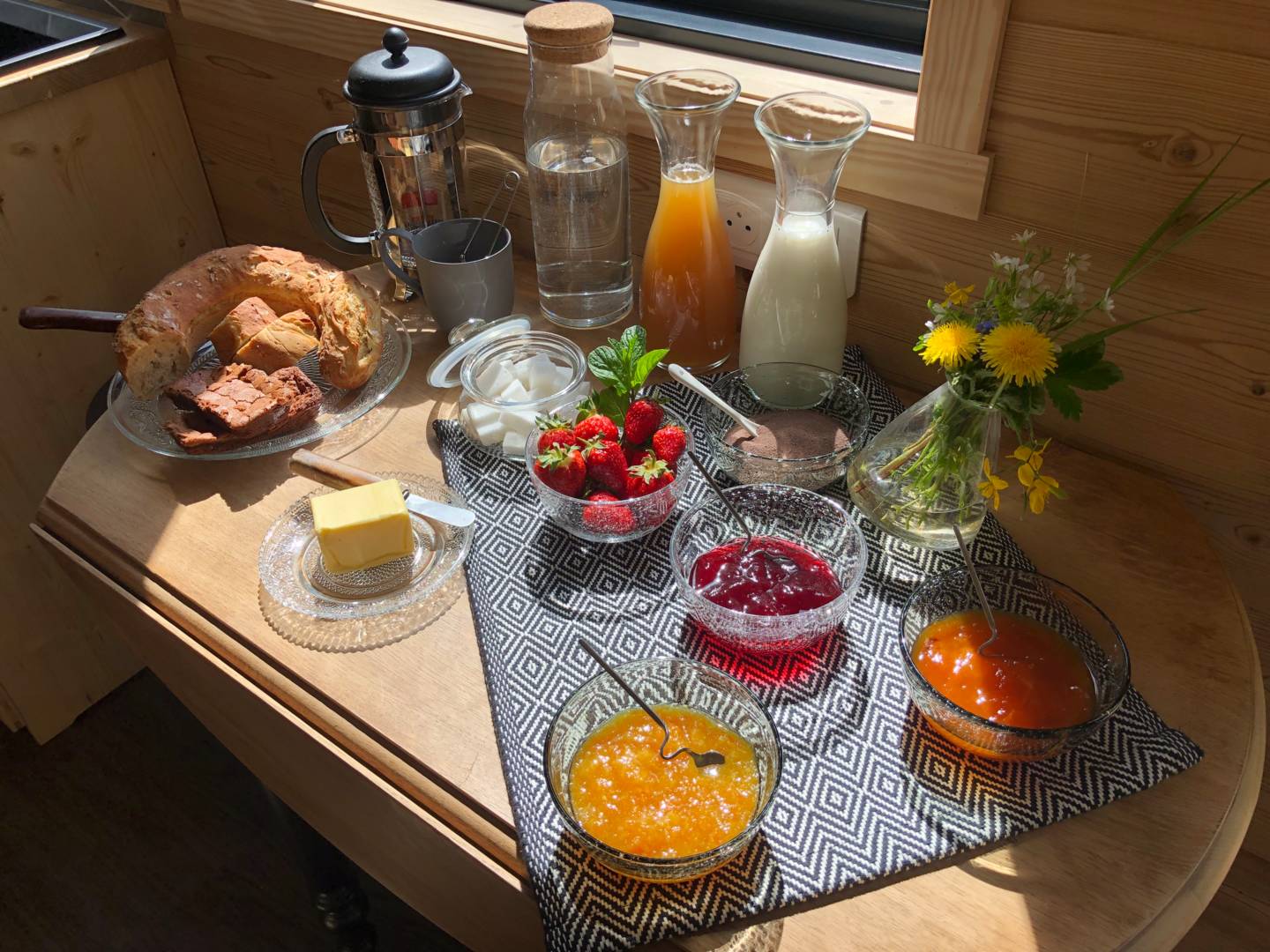A votre arrivée, vous disposerez de café, thé, chocolat, lait, jus de fruit, fruit, yaourts, beurre et confitures. Chaque matin du pain et un gâteau maison vous attendent devant votre porte.