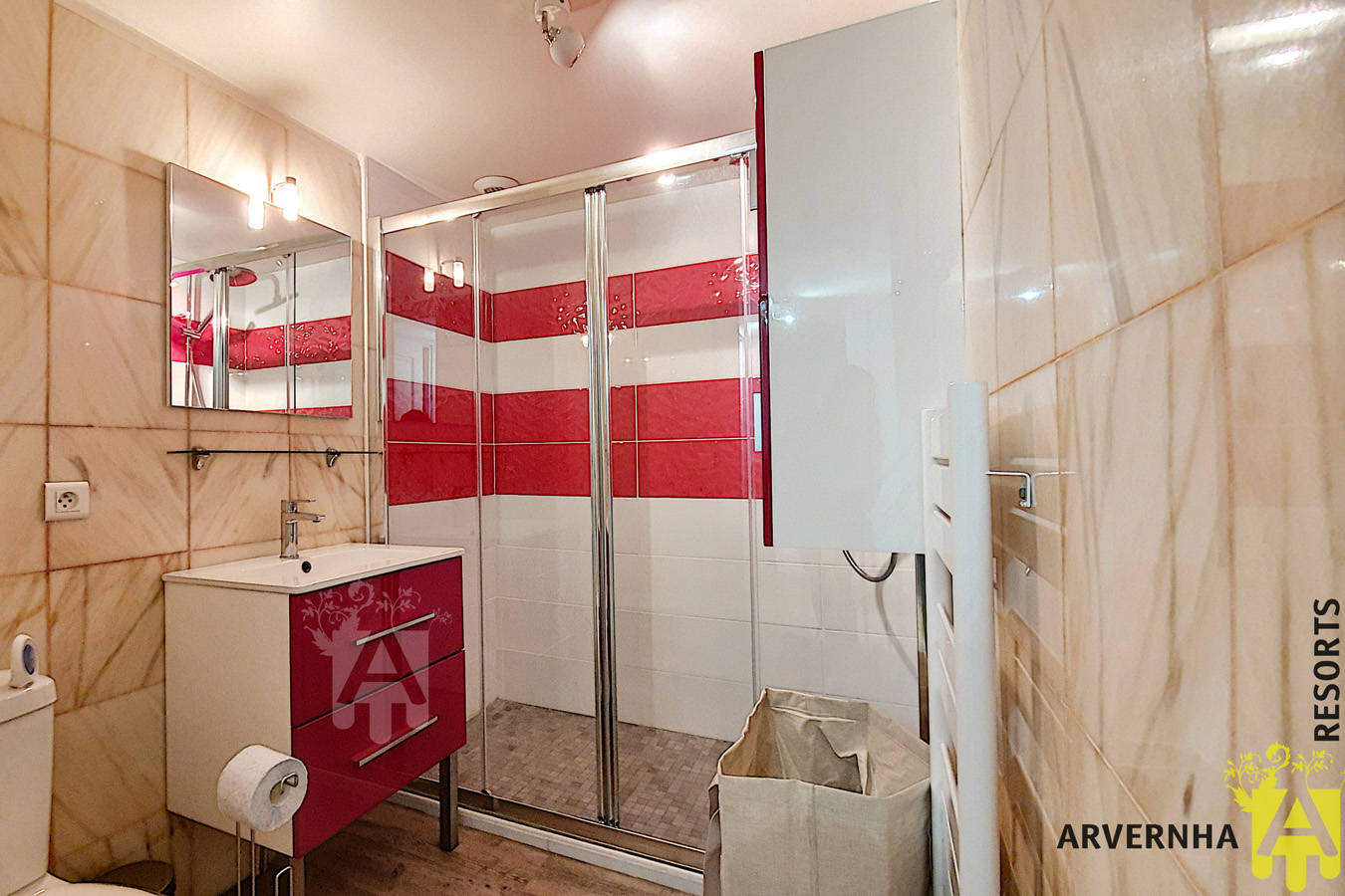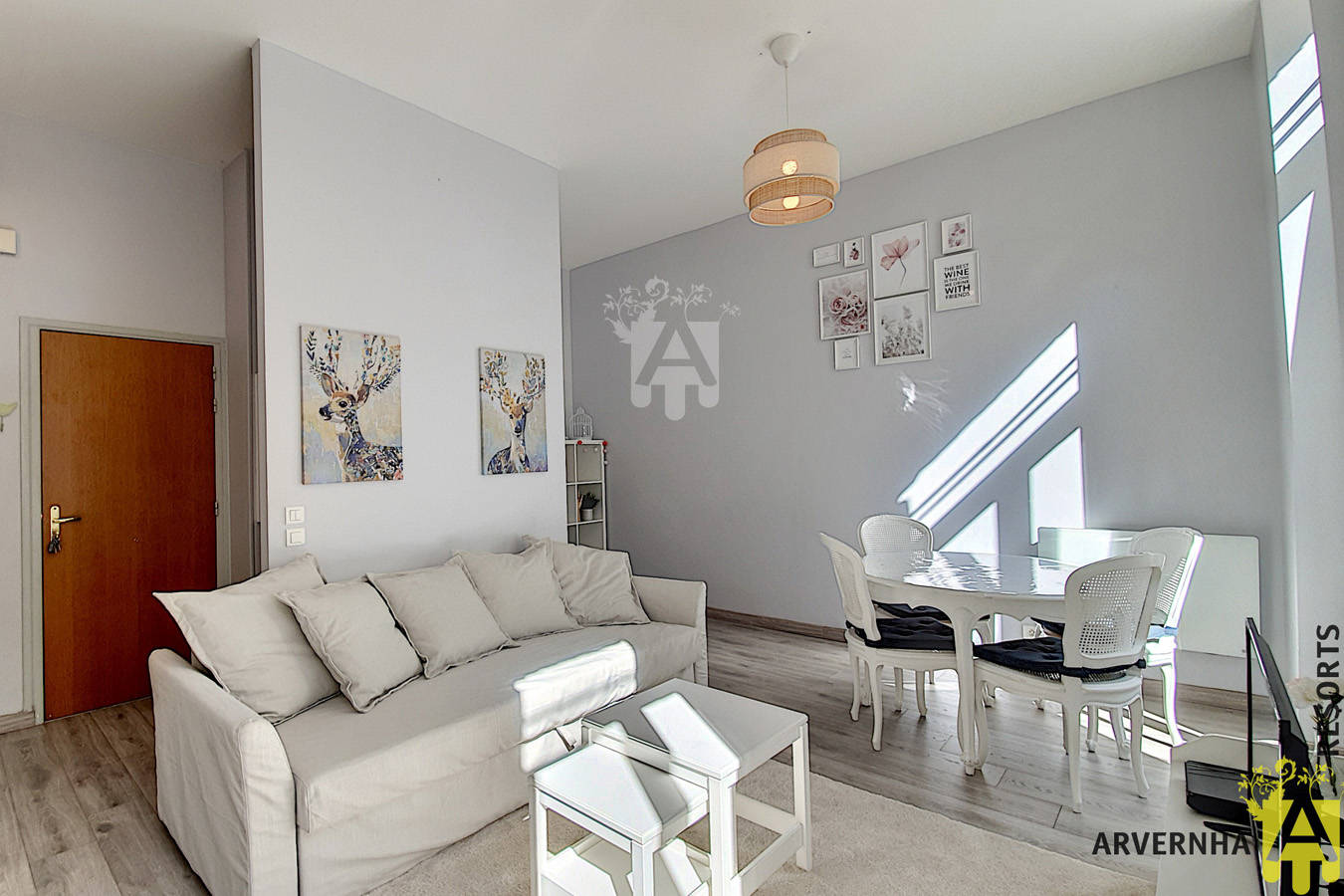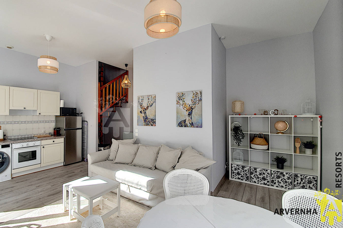 Ce duplex de 55 m2 pour 4 personnes, entièrement refait, vous offre un espace cosy, à la déco charmante. Situé au rez-de-chaussée d’une résidence sécurisée, il se compose de la manière suivante :