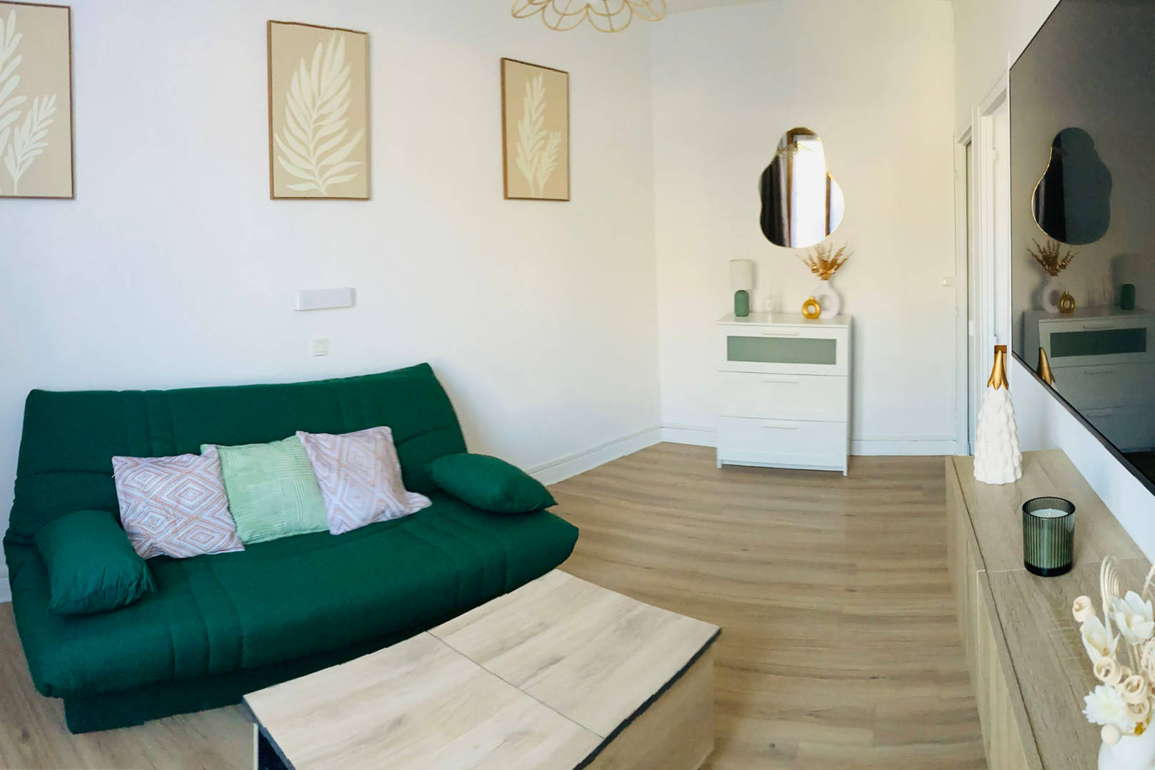 Un salon spacieux et cosy avec canapé clic-clac , télé 4k connectée.
