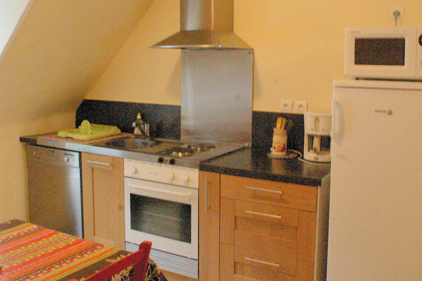 Cuisine, salon / salle à manger avec TV, 2 chambres, buanderie, salle d’eau et WC indépendant.
