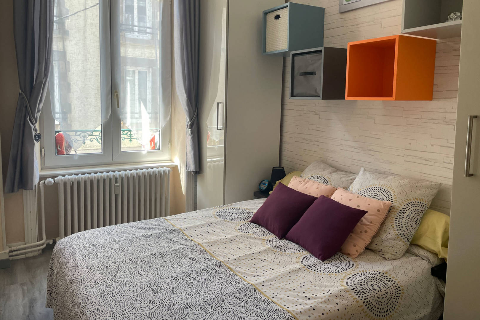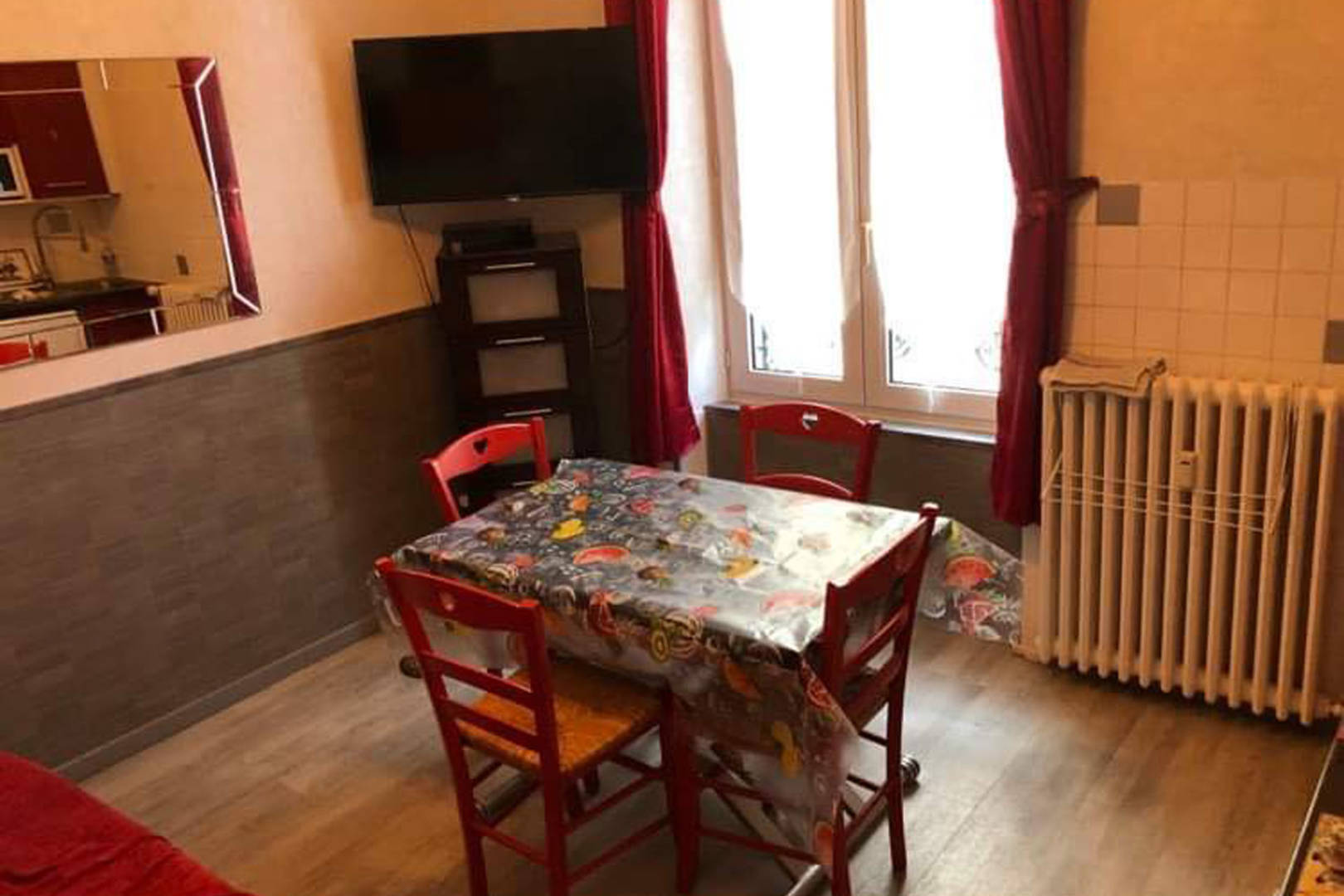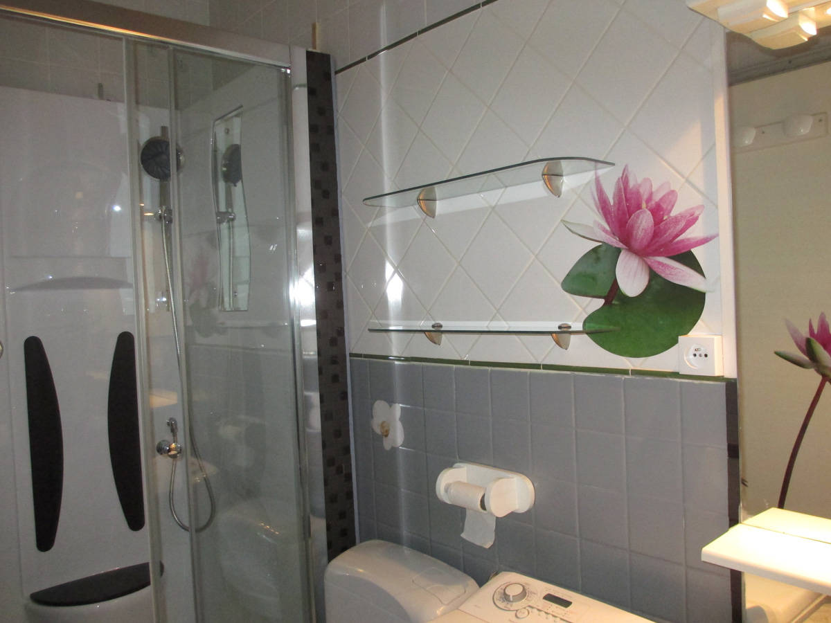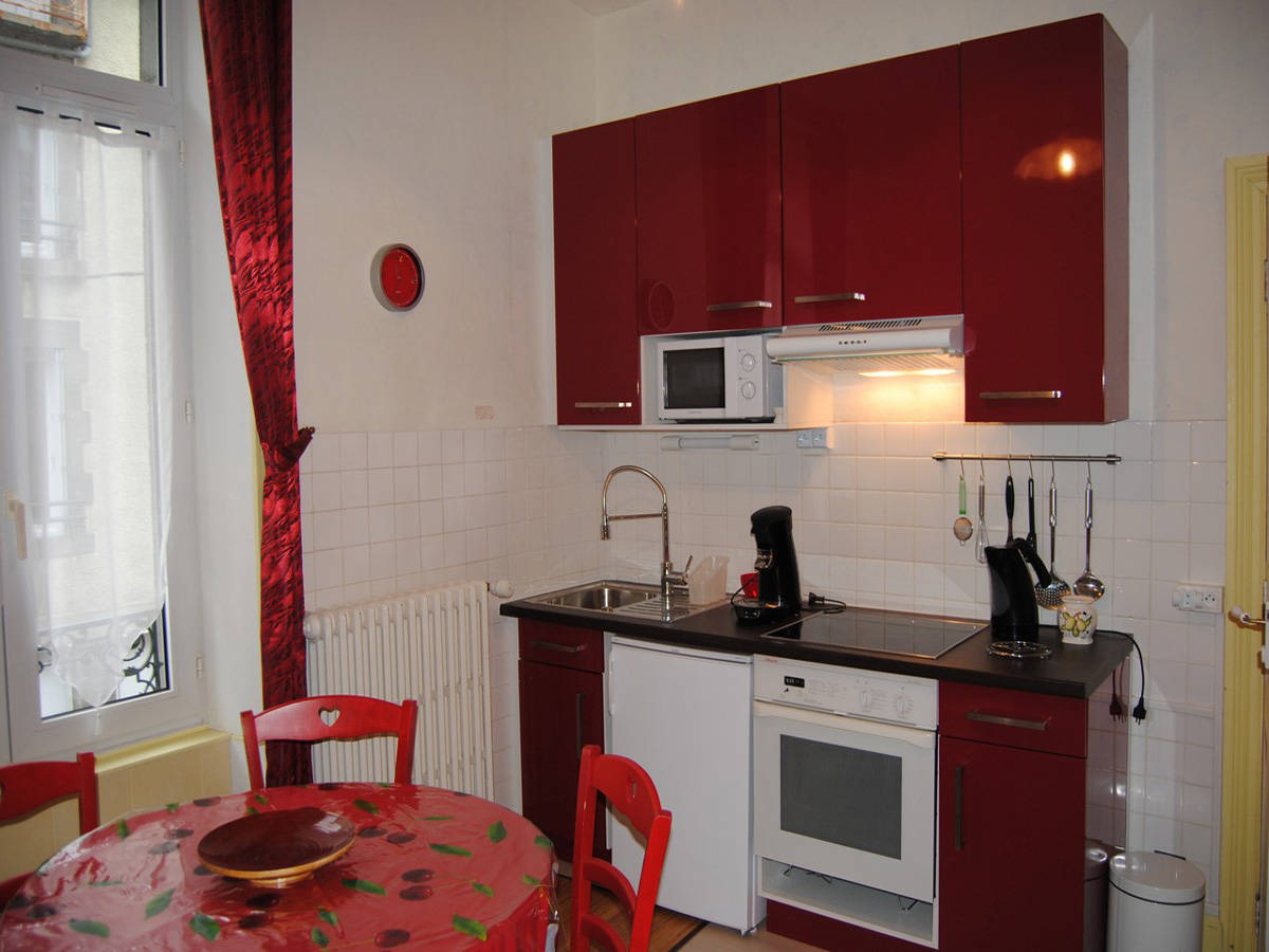 Au 1er étage d’un petit immeuble très calme et lumineux, appartement entièrement équipé, composé d’une pièce à vivre avec coin cuisine, plaque vitrocéramique 4 feux, four chaleur tournante, micro-ondes, appareil à raclette, à fondue, cafetière Senseo, bouilloire, grille-pain… produits ménagers fournis.