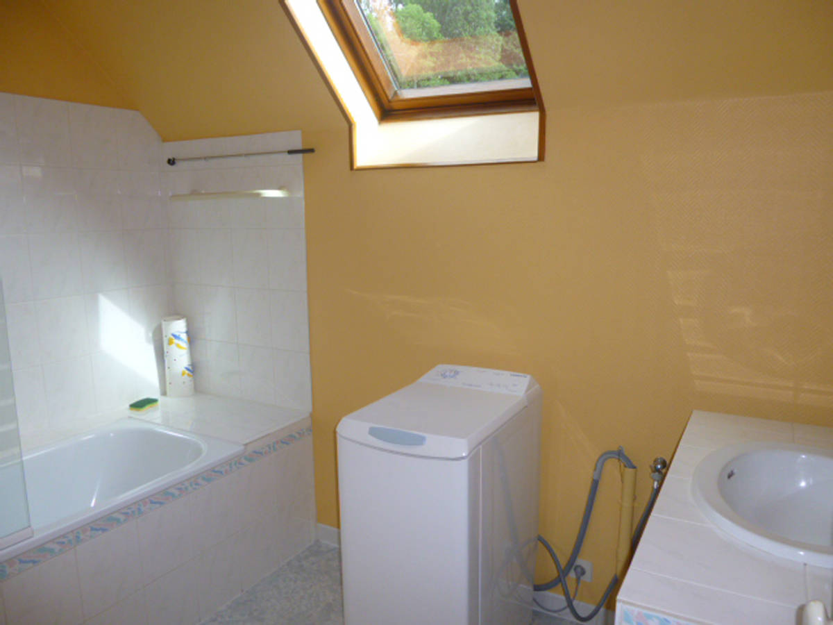 -une salle de bain avec baignoire/douche, machine à laver et WC séparé.