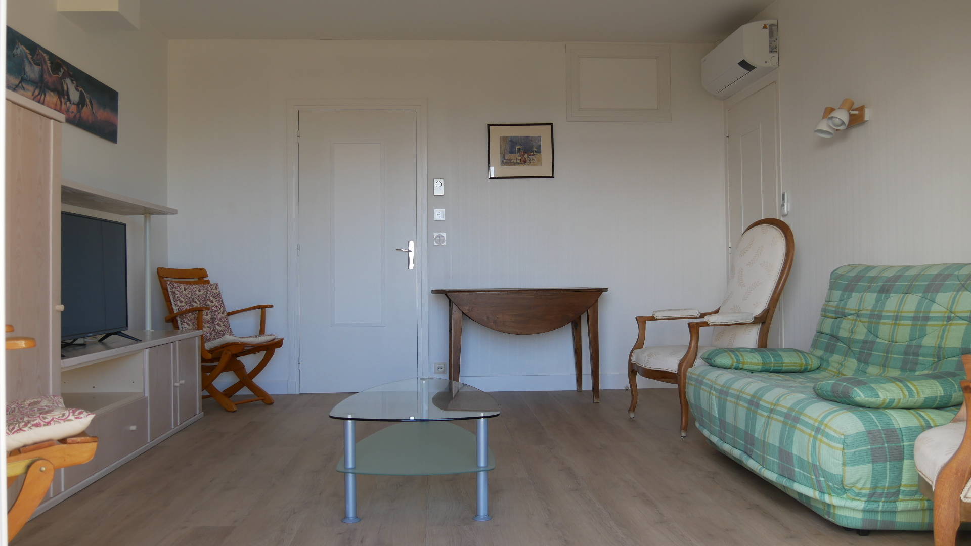 * un vaste séjour avec canapé lit, table pour 6 personnes, coin travail, accès sur une terrasse
