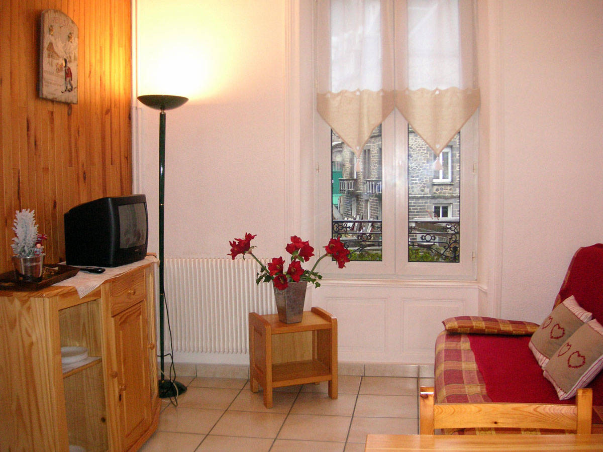 Calme et ensoleillé. A deux pas du centre-ville et des thermes, appartement de plain-pied bien entretenu, avec vue sur le funiculaire et la montagne du Capucin.