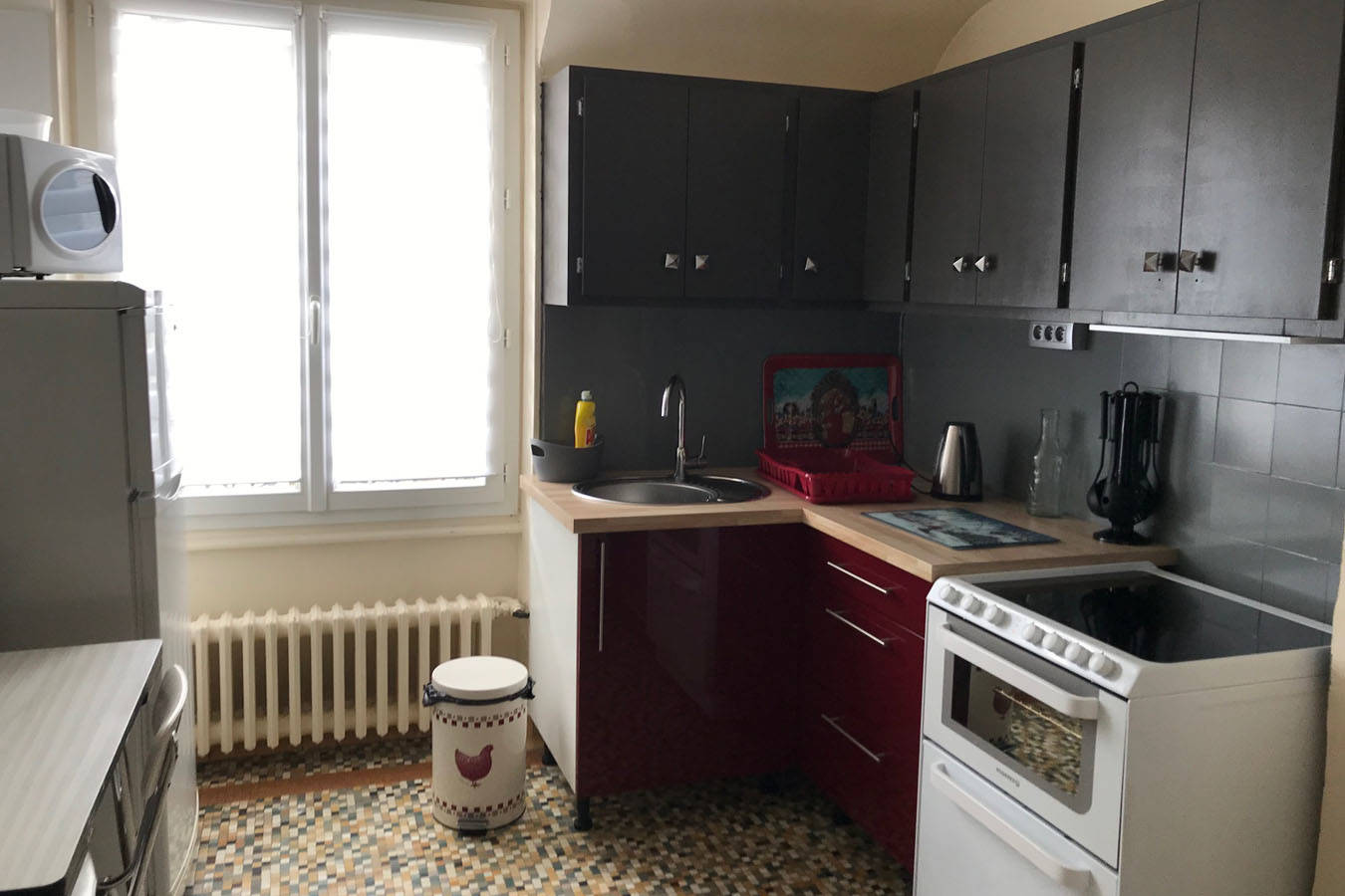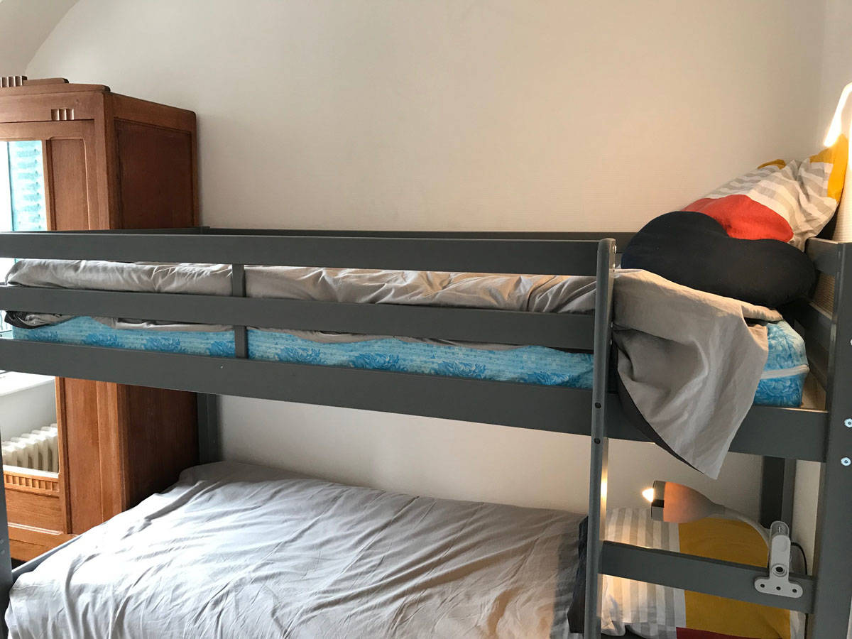 Très lumineux. Cuisine équipée, pièce à vivre, salle de bain traversante, trois chambres : une avec un lit en 160 cm, une avec un lit en 140 cm et une avec deux lits superposés.