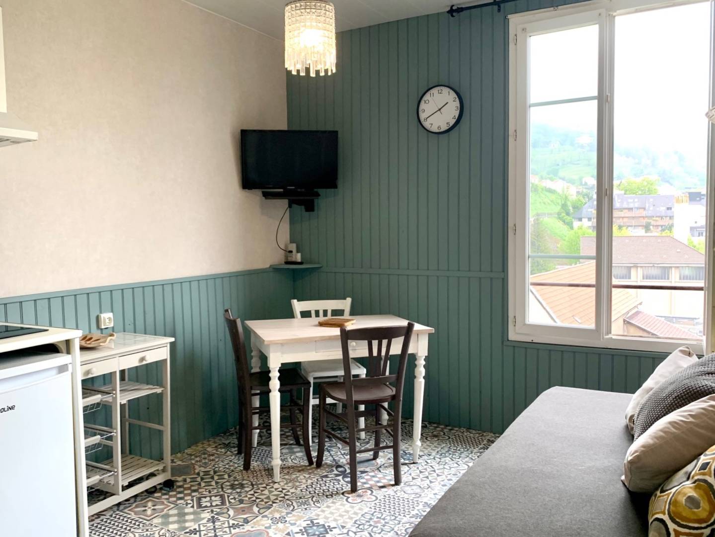 Cuisine/Séjour dînatoire bien équipée. TV écran plat + lecteur DVD. Banquette lit. Grande chambre avec Lit double, Armoire, chevets, bureau et literie anallergique. Salle de bain complète et sèche-serviettes. Internet WIFI. Lave-linge commun gratuit. Chauffage compris. Proche des Thermes, petits Commerces, Bus, Navettes thermales et touristiques, gare SNCF, Casino, Théâtre,(…)