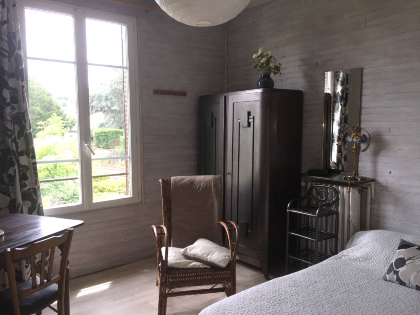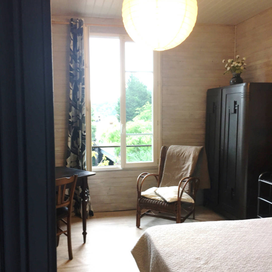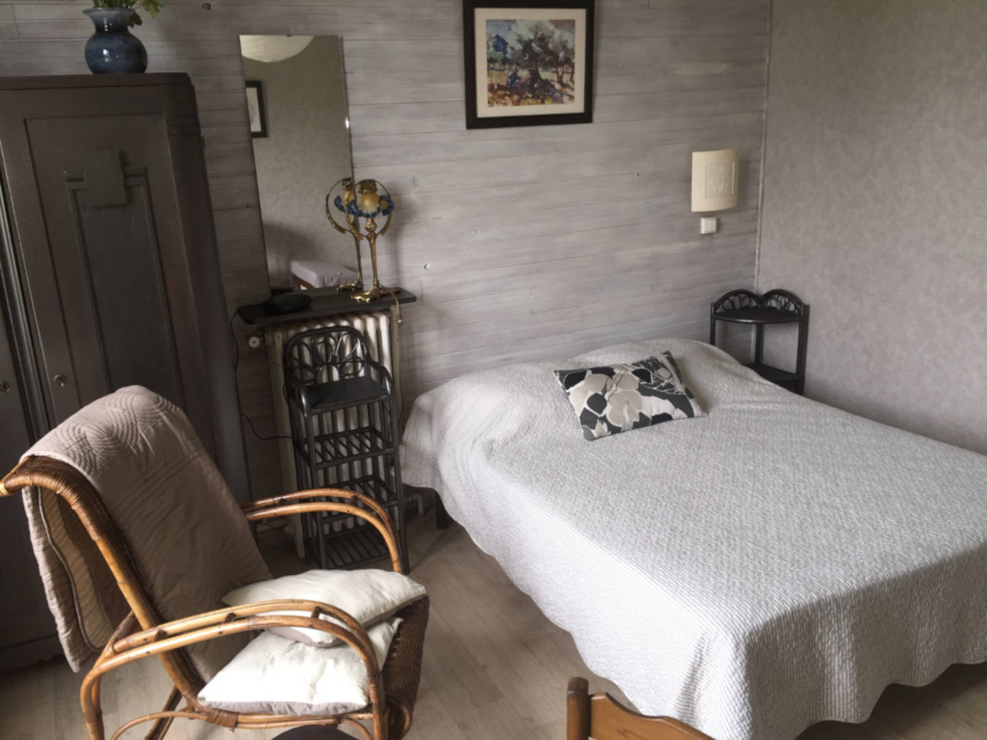 Chambre exposée Est avec grand lit confortable, chevet, fauteuil, Armoire, table, chaises, TV écran plat.