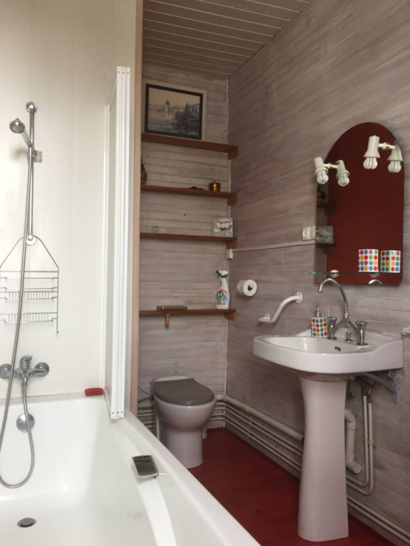 Grande salle de bain complète avec baignoire et sèche serviettes, WC, Lavabo, Rangement.