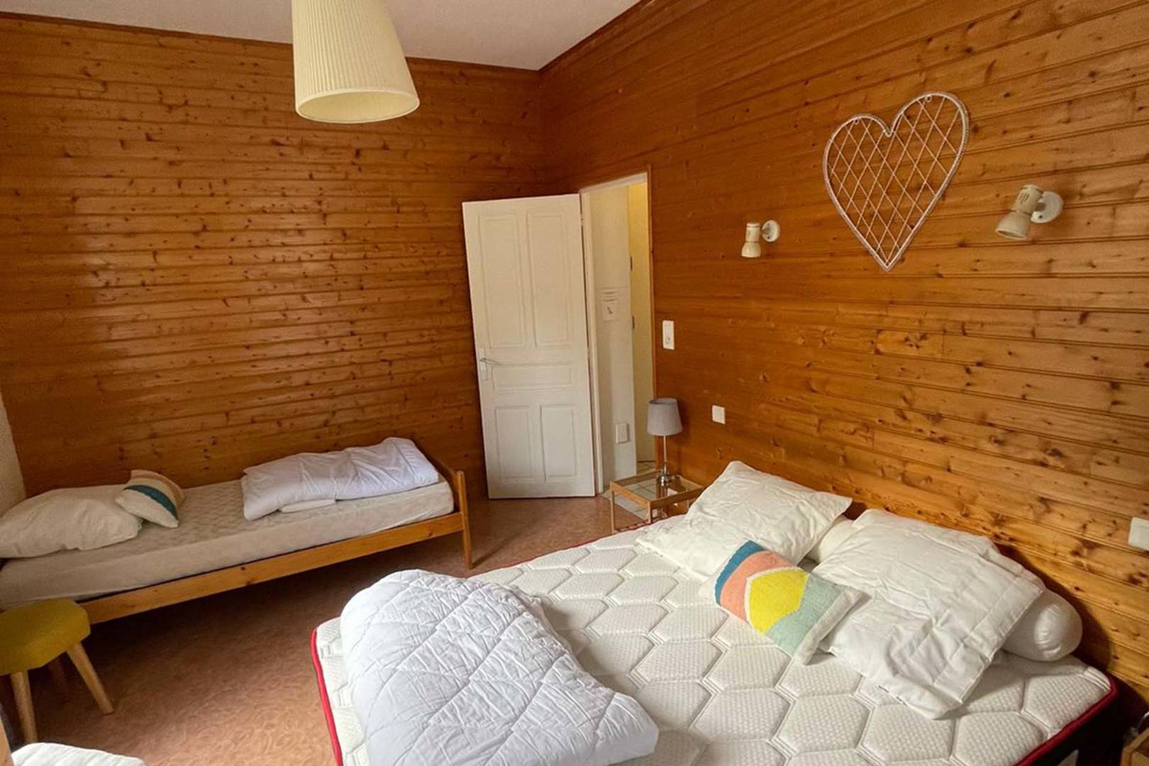 Il est composé d’une cuisine équipée avec canapé et TV, d’une salle de bain avec douche et WC, d’une chambre avec lit de 160 cm et un lit de 90 cm.