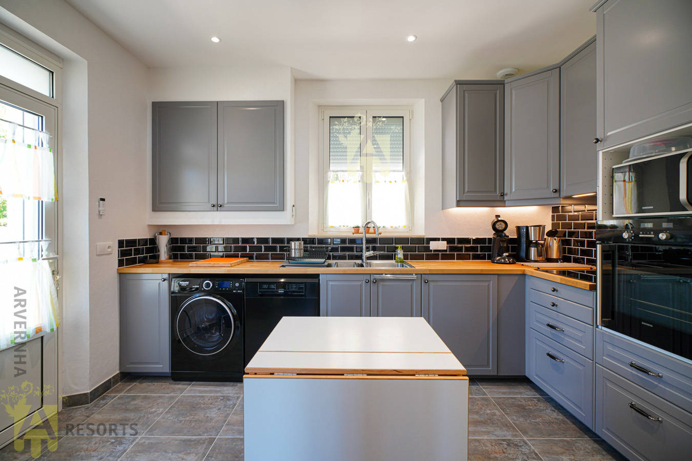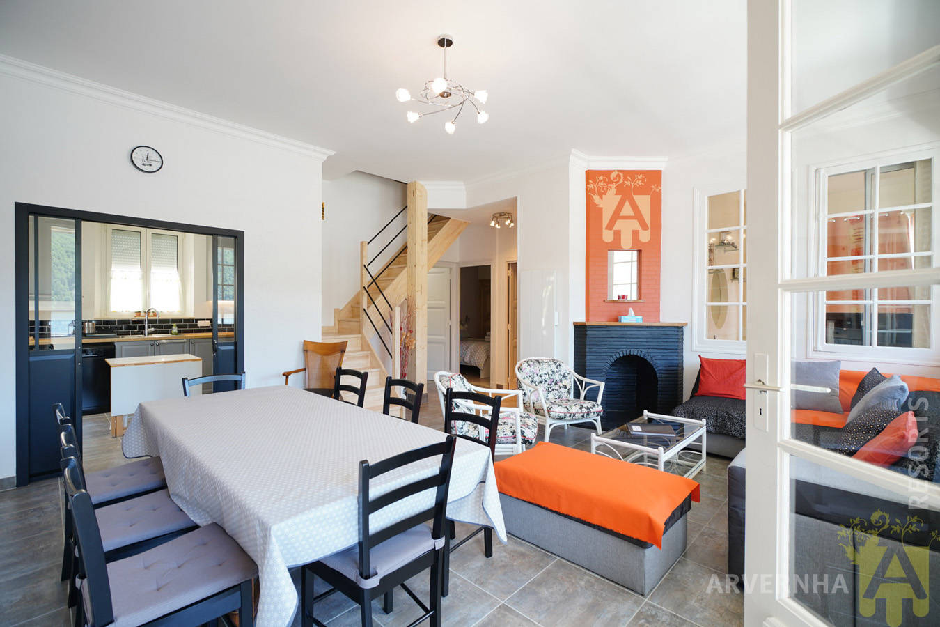 La cuisine aménagée et équipée est très fonctionnelle, et sa porte coulissante façon verrière permet de séparer la cuisine du séjour sans perdre le contact visuel. Les grandes baies vitrées donnent toute sa luminosité au séjour, pour des repas ou des pauses dans le salon des plus agréables.