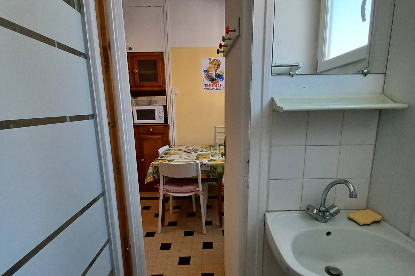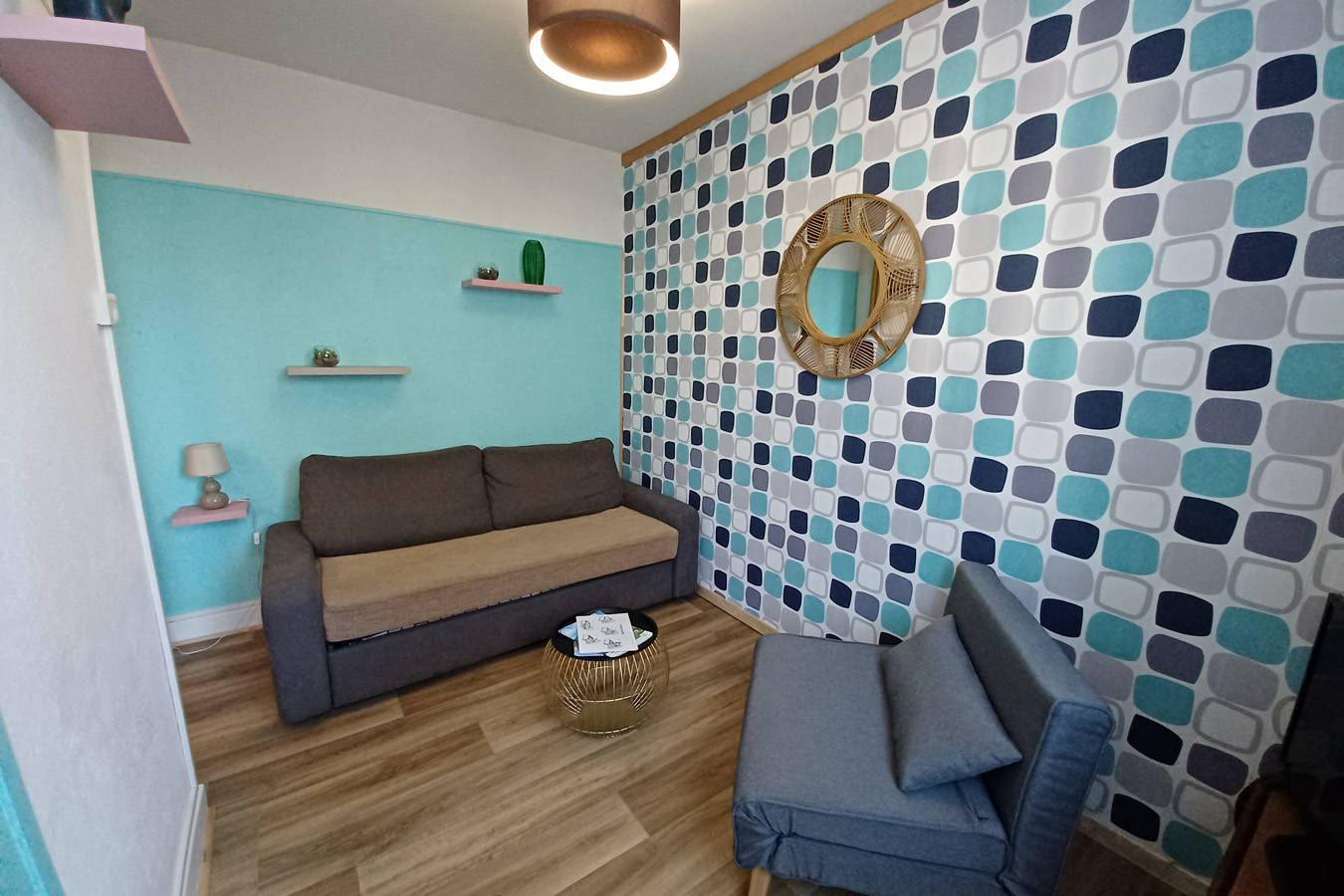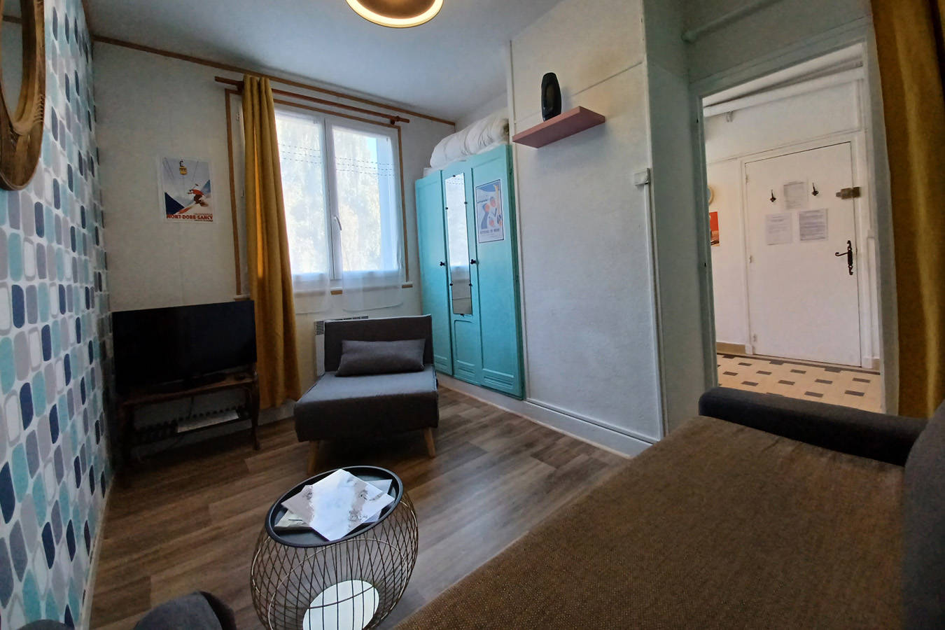 Appartement de 22m² au 1er étage, 3 couchages, chambre salon avec canapé rapido et fauteuil convertible, cuisine, lavabo et douche, toilettes.