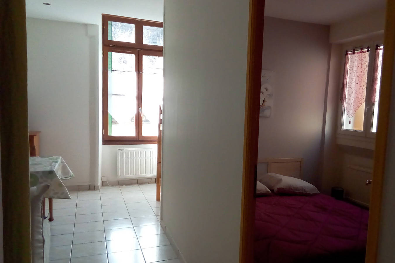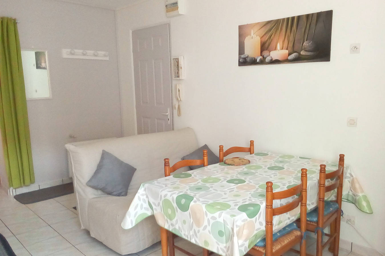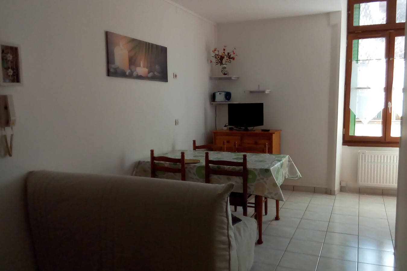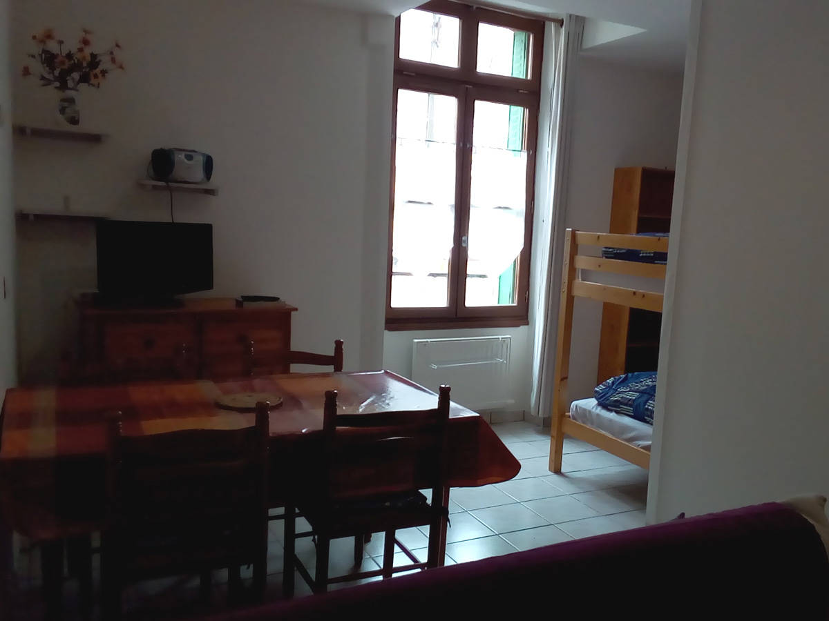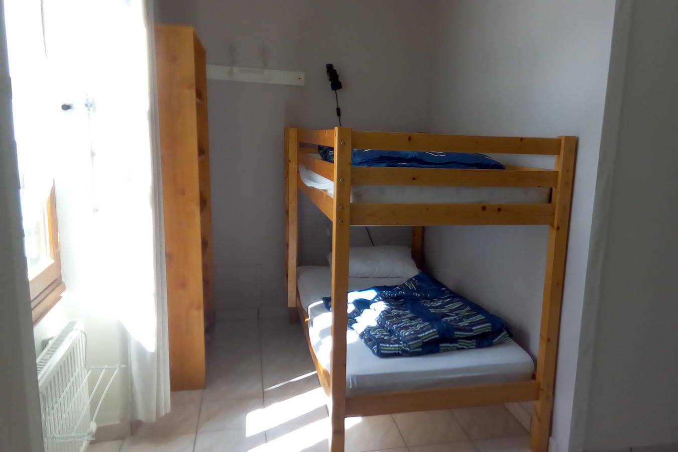 Le logement comprend un séjour avec table, canapé BZ, une télévision et un retour avec espace pour les lits superposés et une bibliothèque.