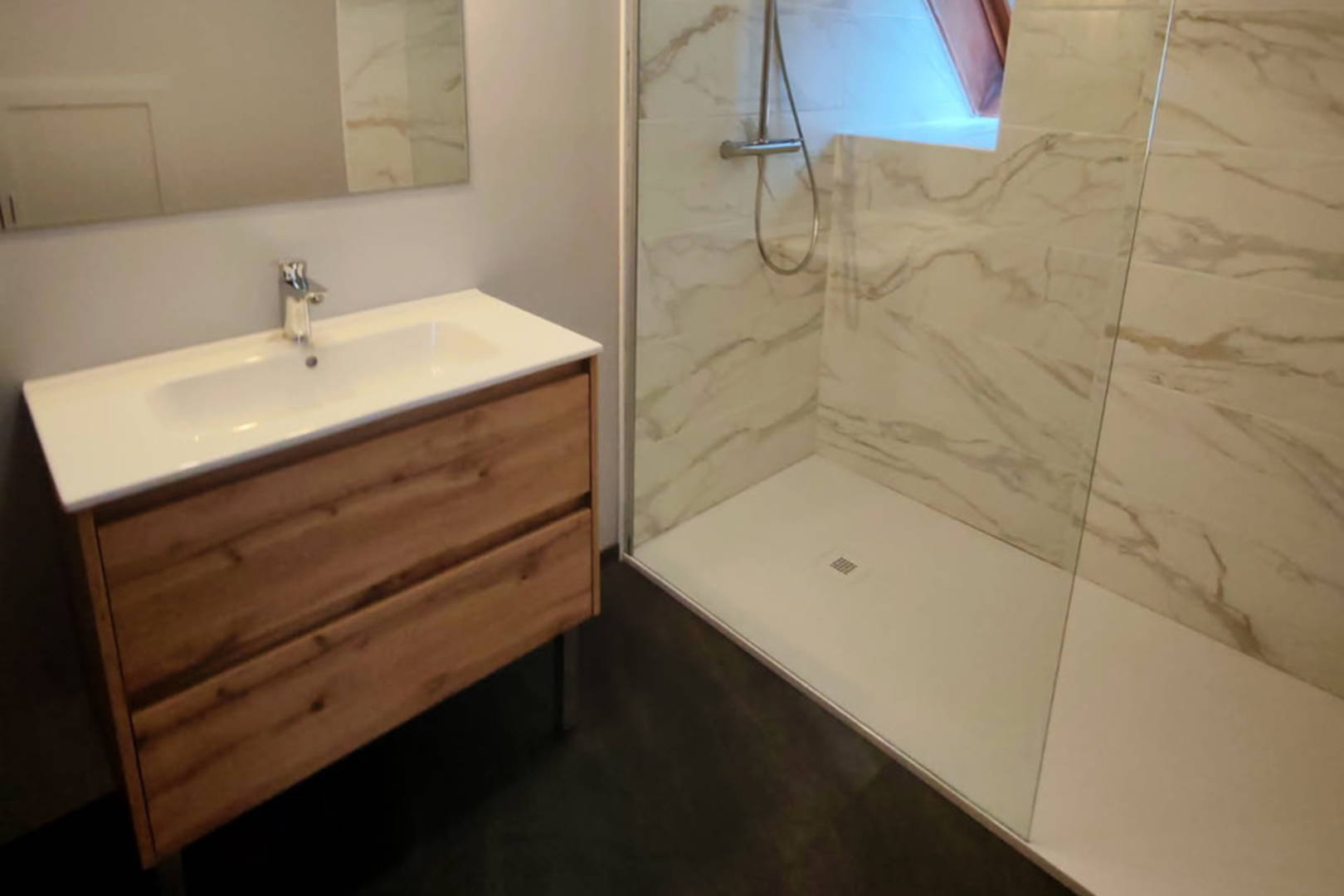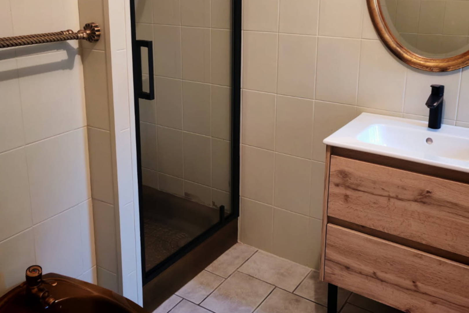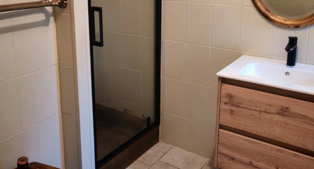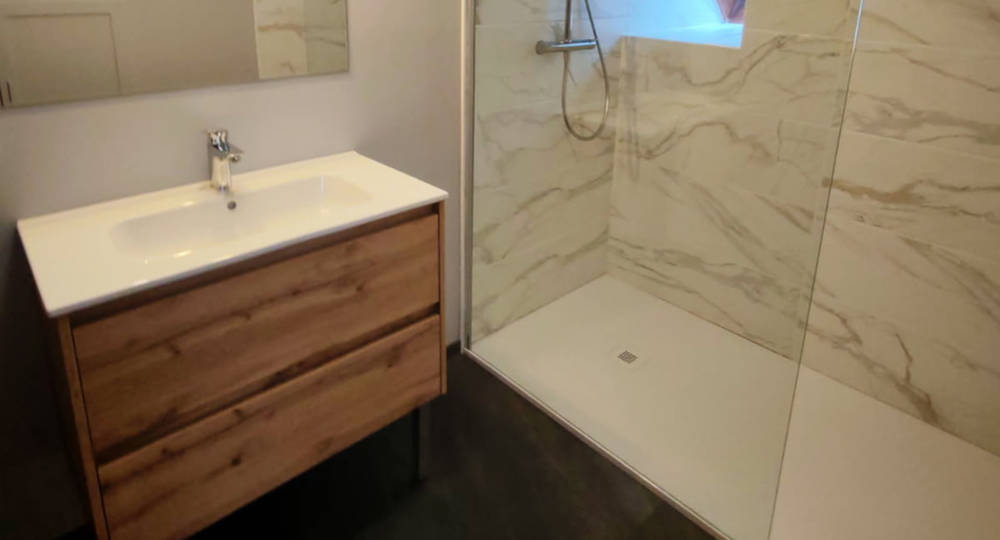 Une belle mezzanine de 30m2 avec couchage de 140×190 et petit salon, salle de bain avec douche italienne et vasque, wc indépendant.