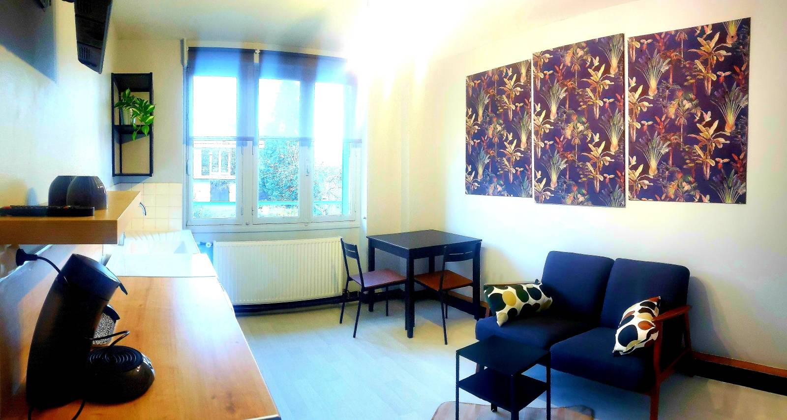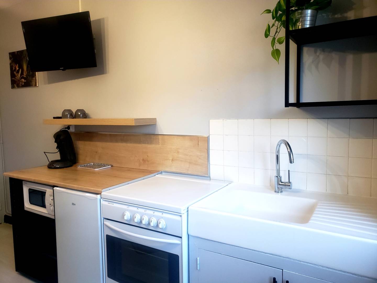 L’appartement se compose d’une pièce de vie spacieuse avec un espace cuisine équipée d’une gazinière, d’un four micro-onde, d’un frigo table top, d’une cafetière Senseo et d’un espace salon avec un canapé 2 places et une télévision.