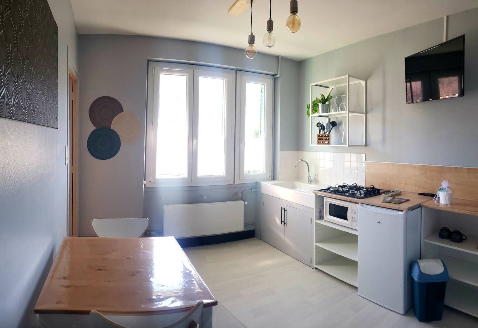 Restauré au printemps 2022, il y règne une ambiance rétro avec son lavabo d’époque installé dans la chambre et son grand évier blanc en céramique dans la cuisine, mélangé à des meubles contemporains d’inspiration industriel.