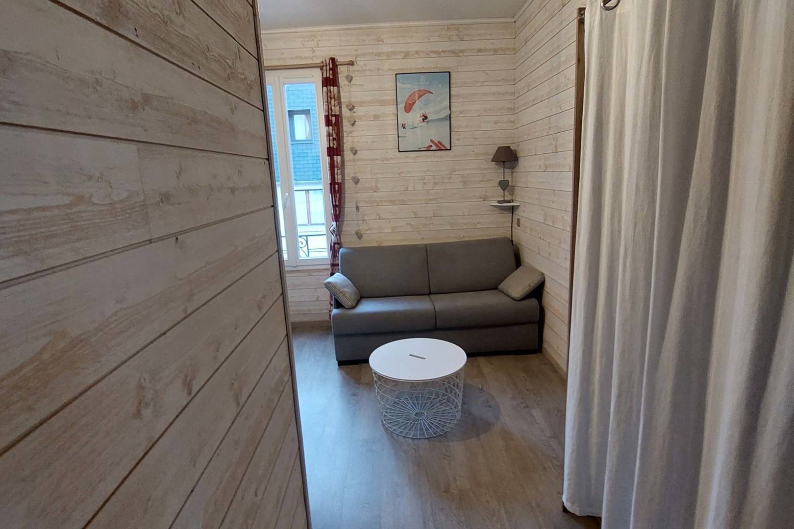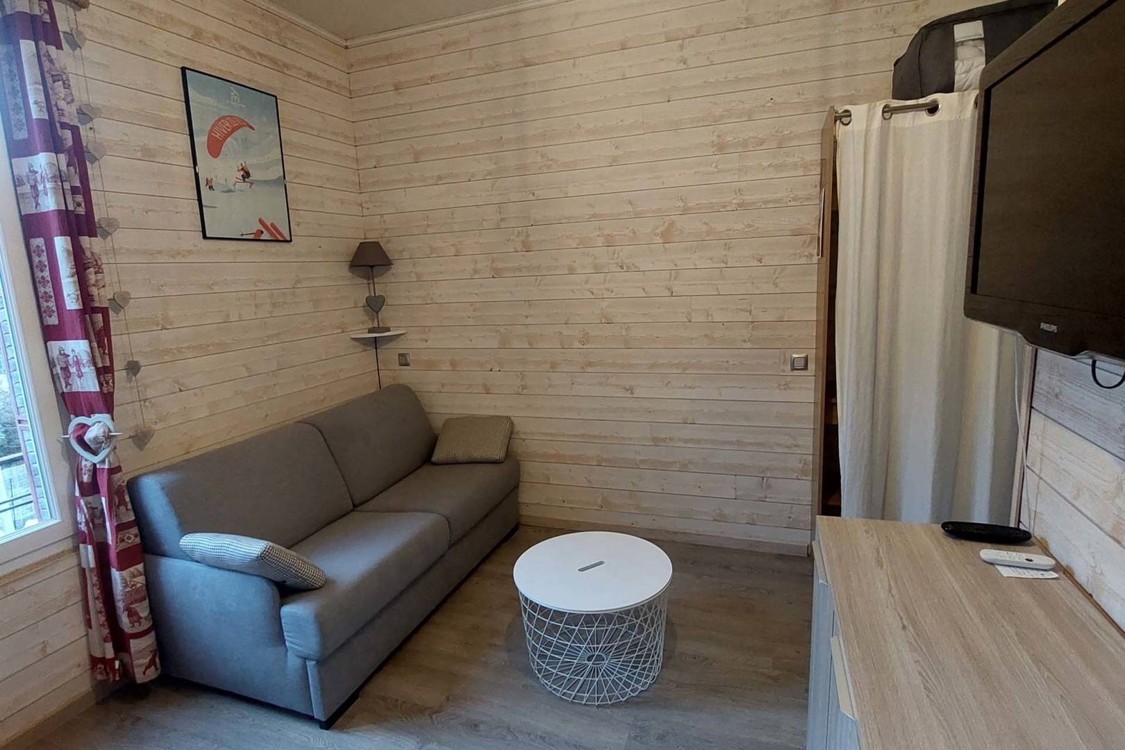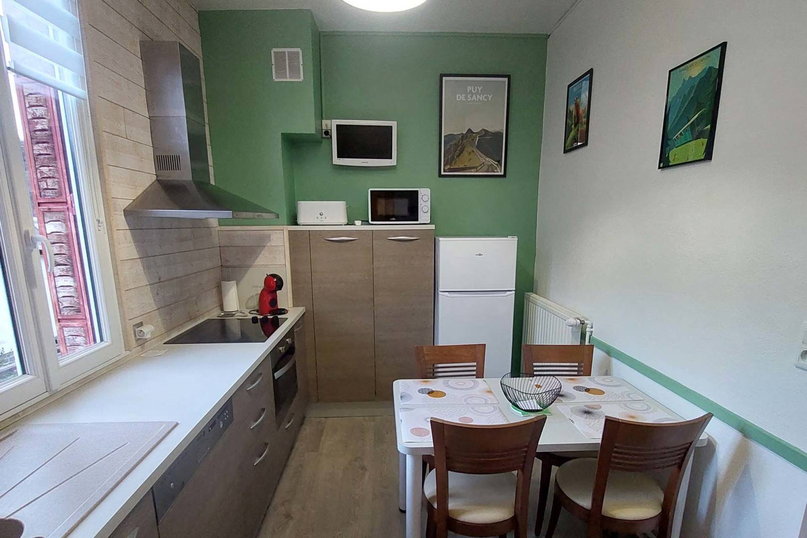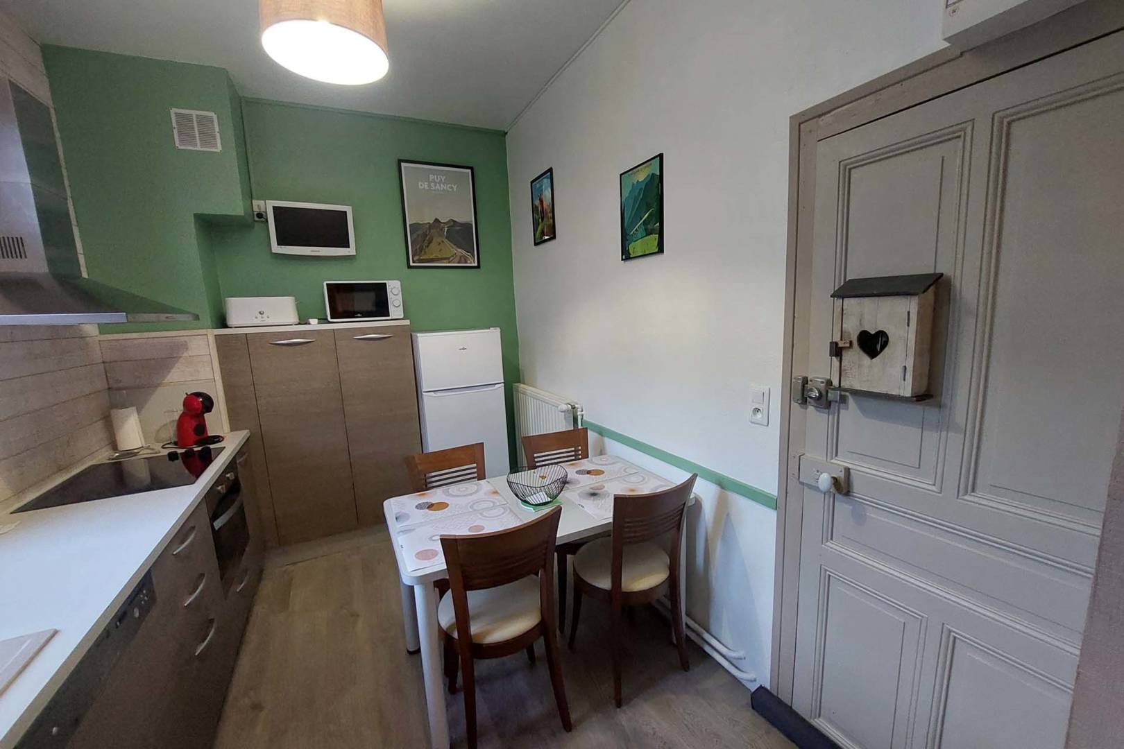 L’appartement se compose d’une entrée donnant directement sur la cuisine très bien équipée avec un coin repas pour quatre personnes, d’une pièce de vie avec un canapé convertible haut de gamme neuf (matelas simmons), un clic-clac de qualité, une TV écran plat de 80cm, un placard et une commode pour ranger vos affaires. Il dispose également d’une connexion internet par wifi ainsi que d’un appareil de streaming (Chromecast) si vous disposez d’un compte Canal +, Netflix, etc. Enfin, la salle d’eau est équipée d’une grande douche, d’un meuble vasque avec miroir, d’un WC et d’un sèche serviettes.