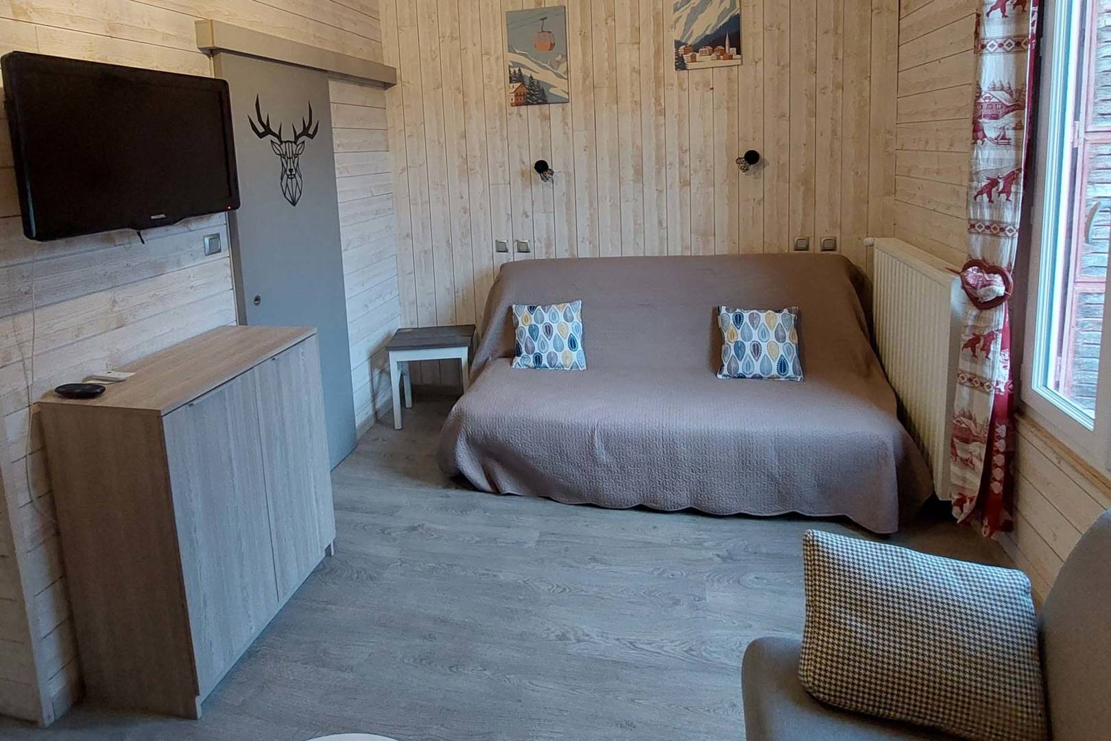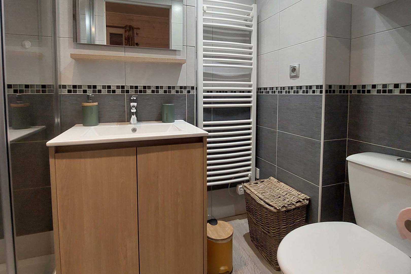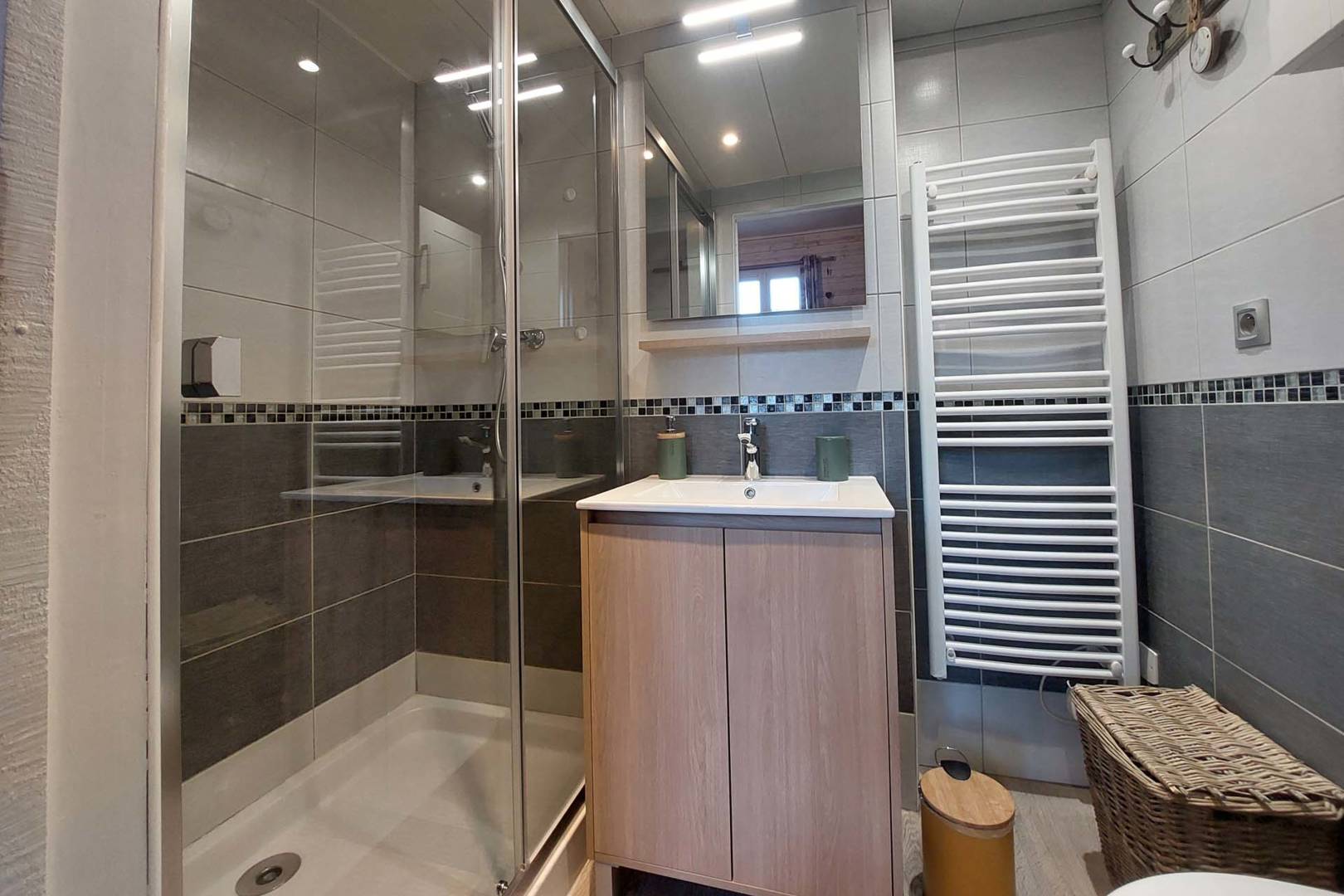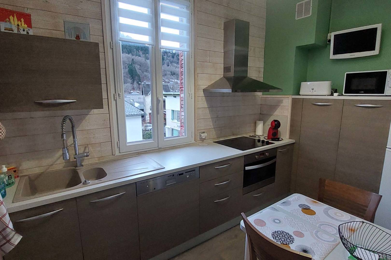 L’appartement se compose d’une entrée donnant directement sur la cuisine très bien équipée avec un coin repas pour quatre personnes, d’une pièce de vie avec un canapé convertible haut de gamme neuf (matelas simmons), un clic-clac de qualité, une TV écran plat de 80cm, un placard et une commode pour ranger vos affaires. Il dispose également d’une connexion internet par wifi ainsi que d’un appareil de streaming (Chromecast) si vous disposez d’un compte Canal +, Netflix, etc. Enfin, la salle d’eau est équipée d’une grande douche, d’un meuble vasque avec miroir, d’un WC et d’un sèche serviettes.