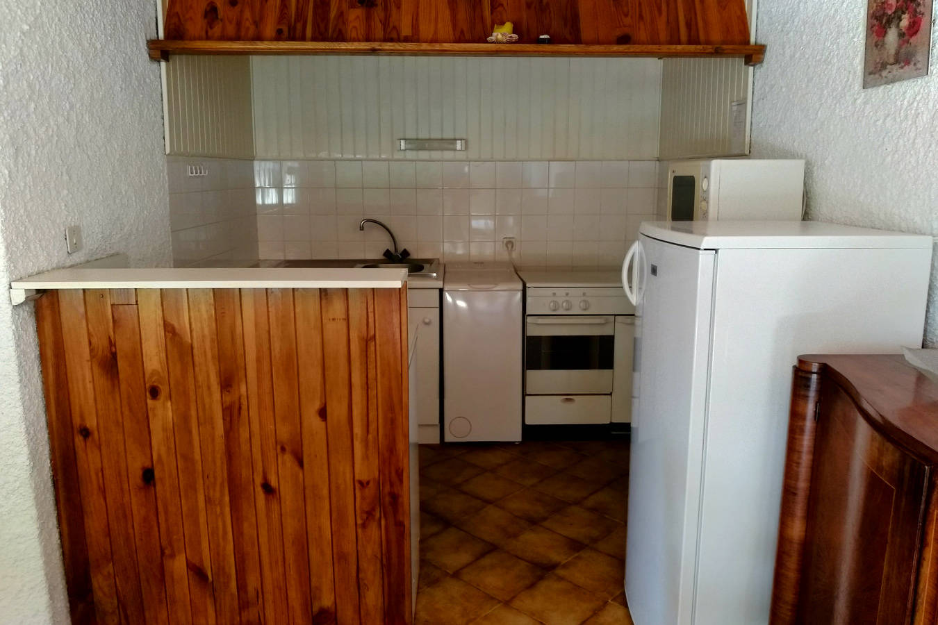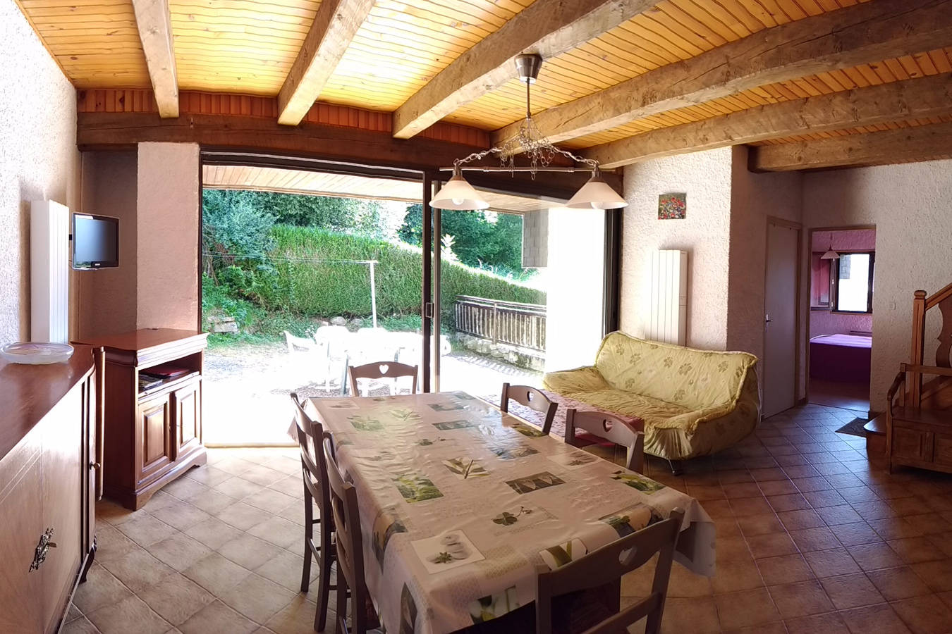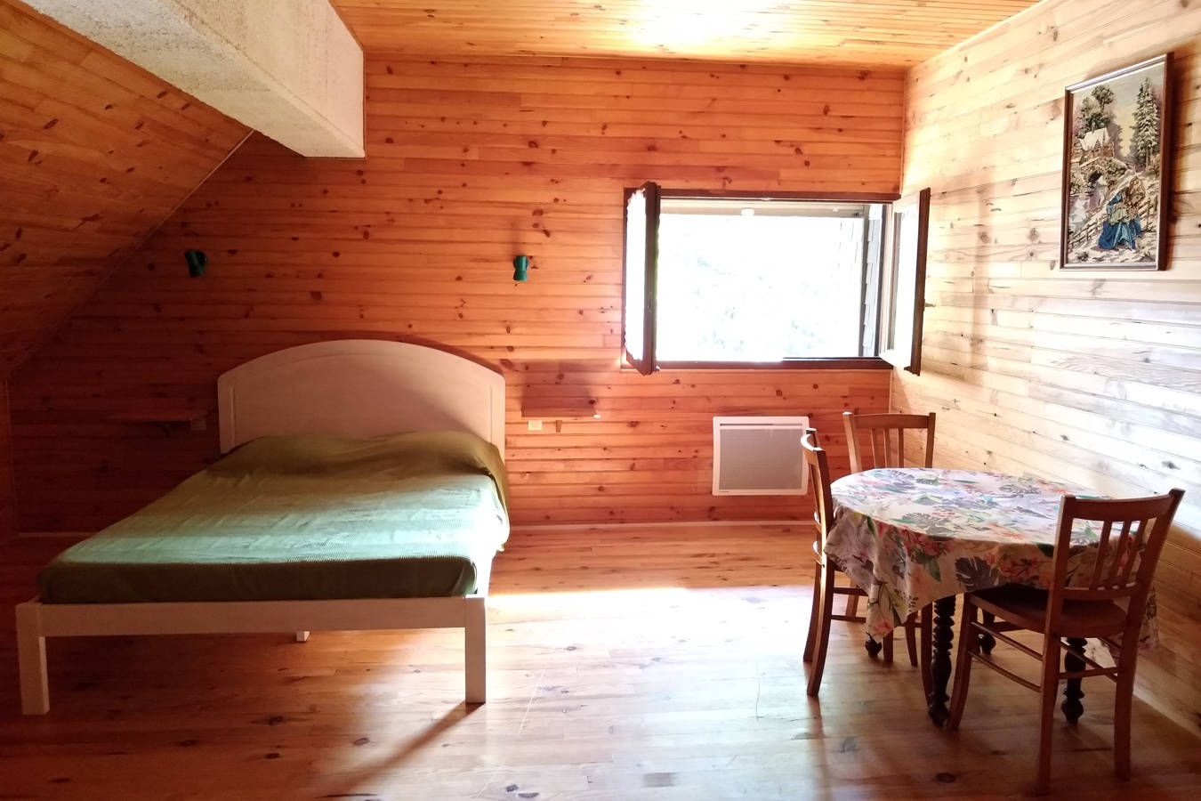 L’intérieur crépi et lambris lui confère un cadre chaleureux, particulièrement propice à la détente et au repos.