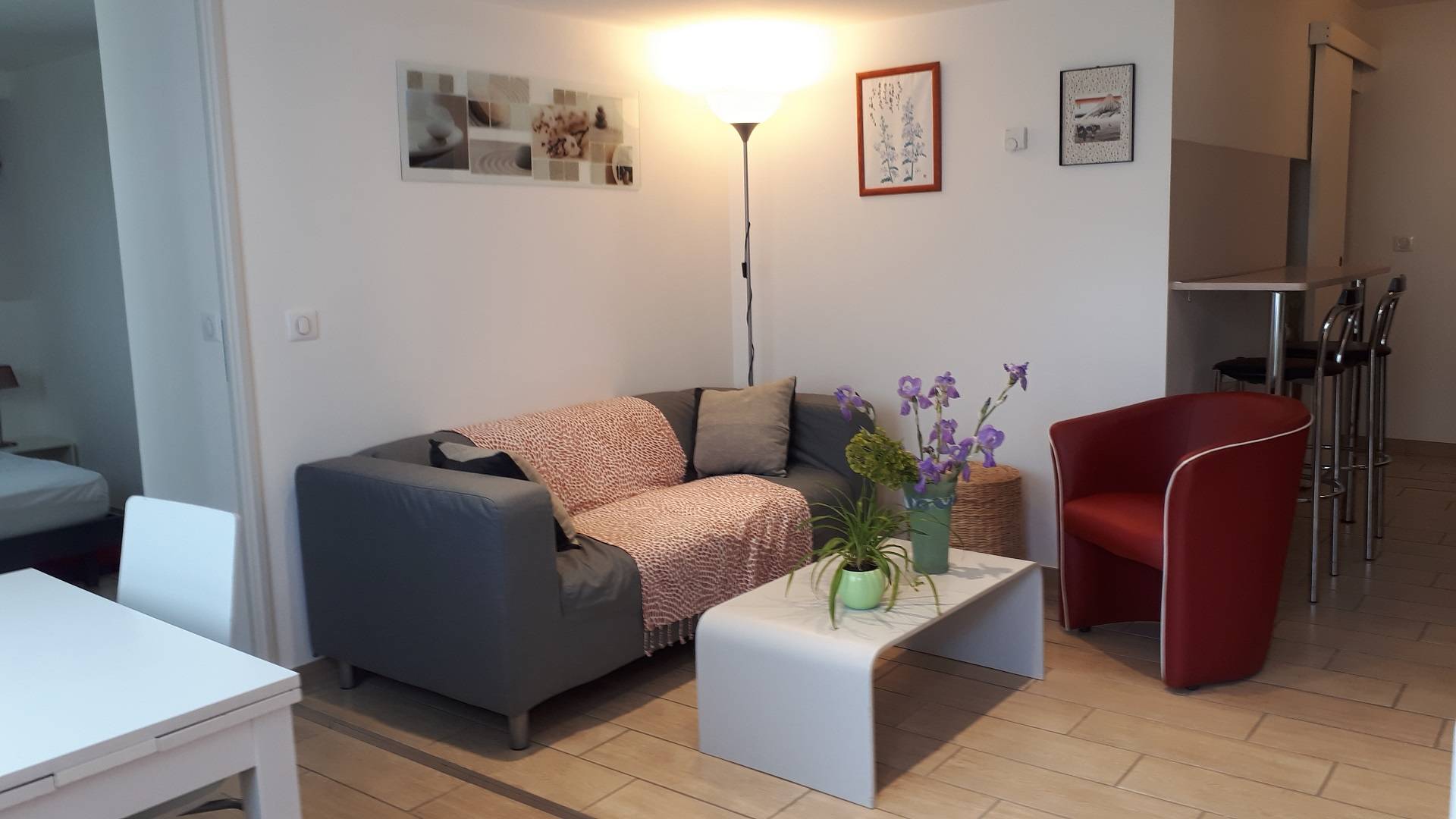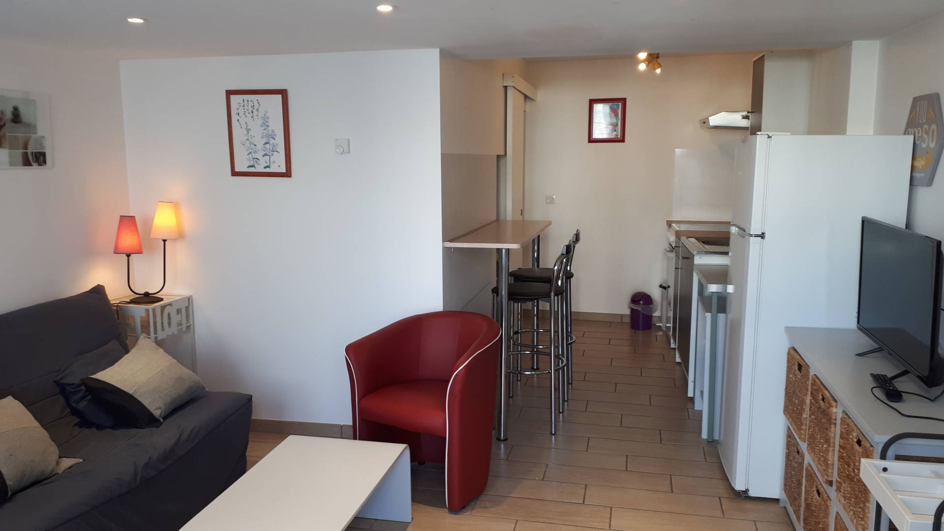 L’appartement comprend un salon, une cuisine américaine, une chambre séparée, une salle d’eau, un wc séparé.