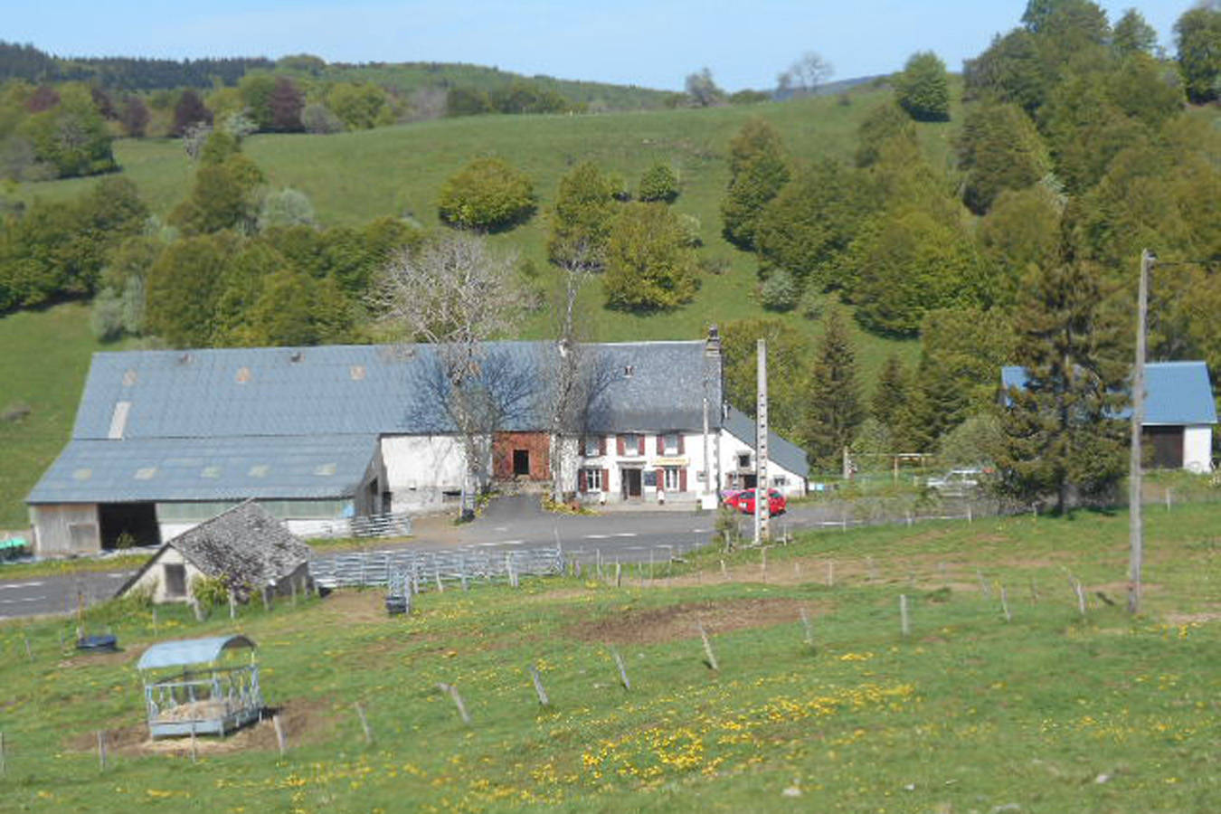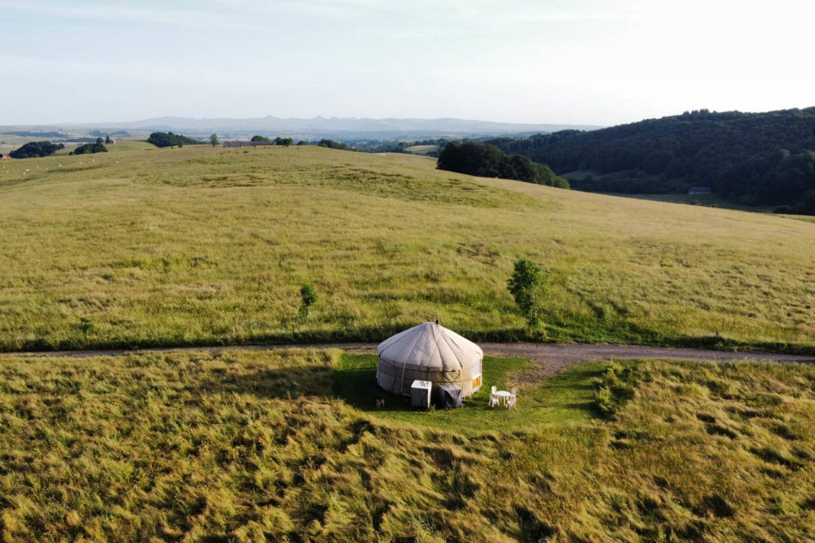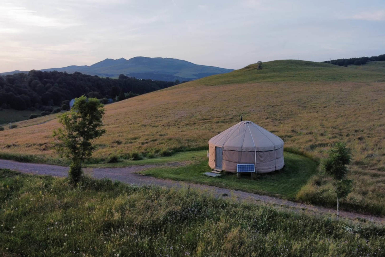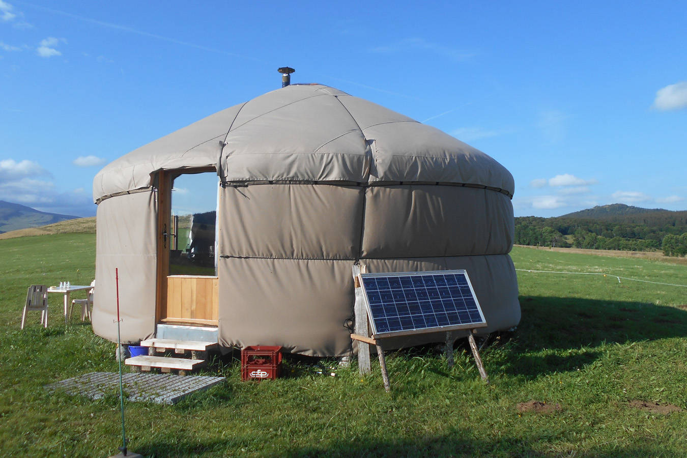 La yourte située à 250m. de la ferme, en haut d’un petit chemin carrossable, vous offre un magnifique panorama à 360° sur le Sancy, le Cézallier et le Plomb du Cantal.