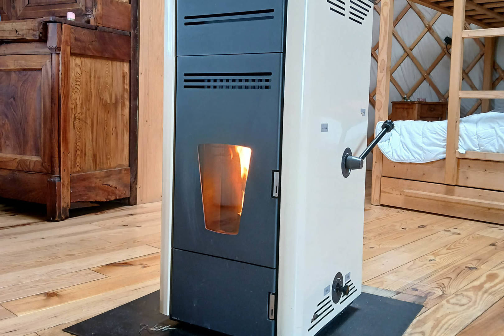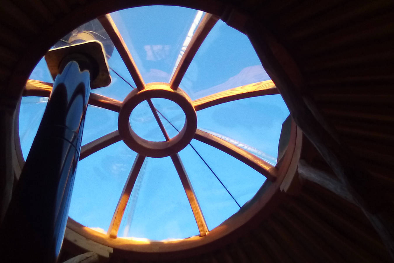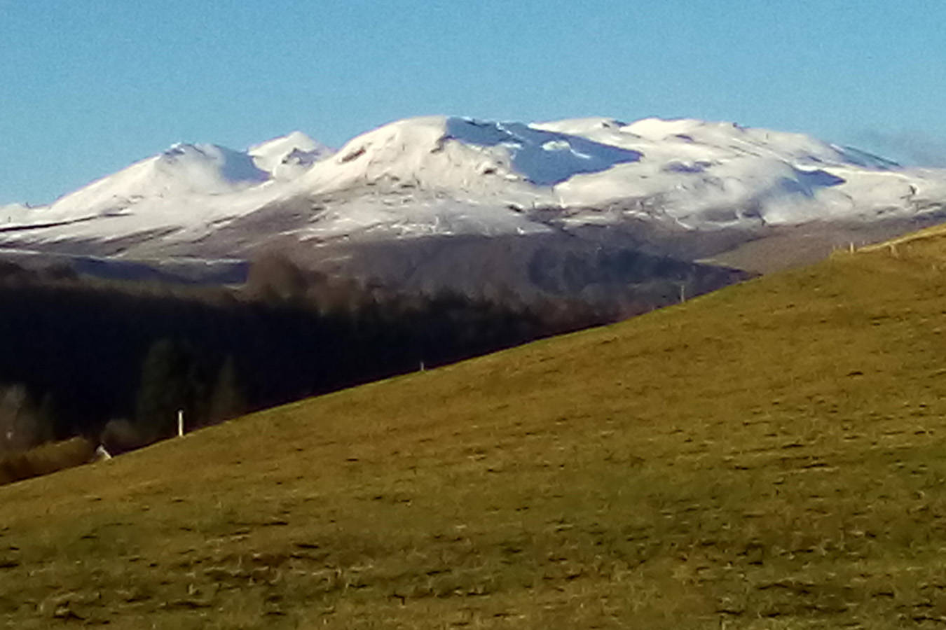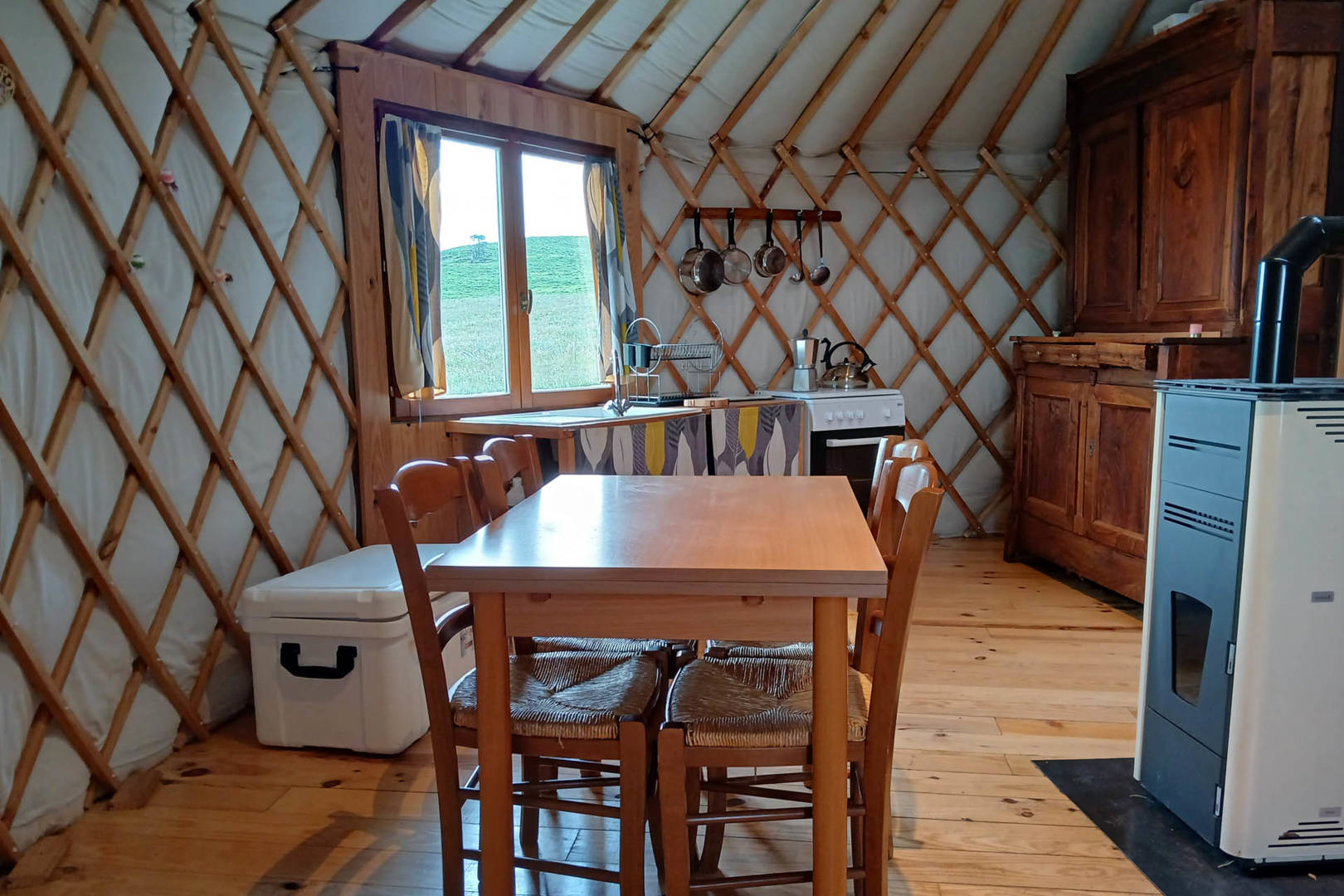 La yourte située à 250m. de la ferme, en haut d’un petit chemin carrossable, vous offre un magnifique panorama à 360° sur le Sancy, le Cézallier et le Plomb du Cantal.