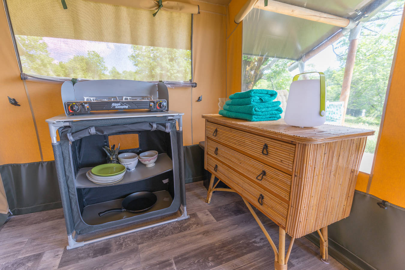 – Draps fournis, location de serviettes de toilette et duvets pour les tentes.