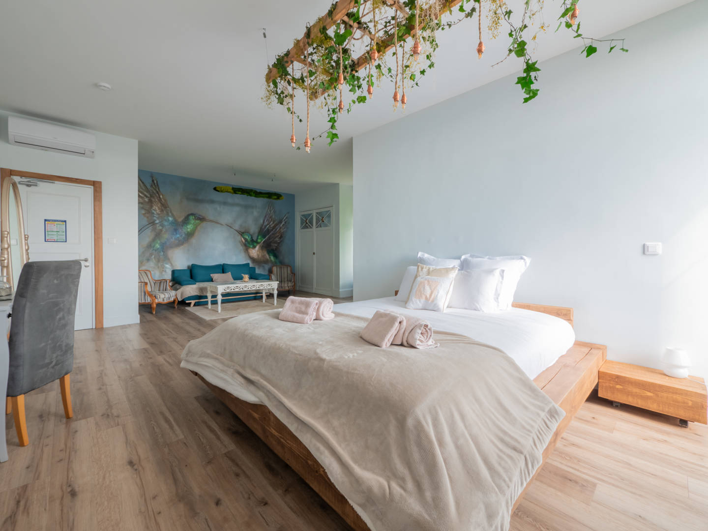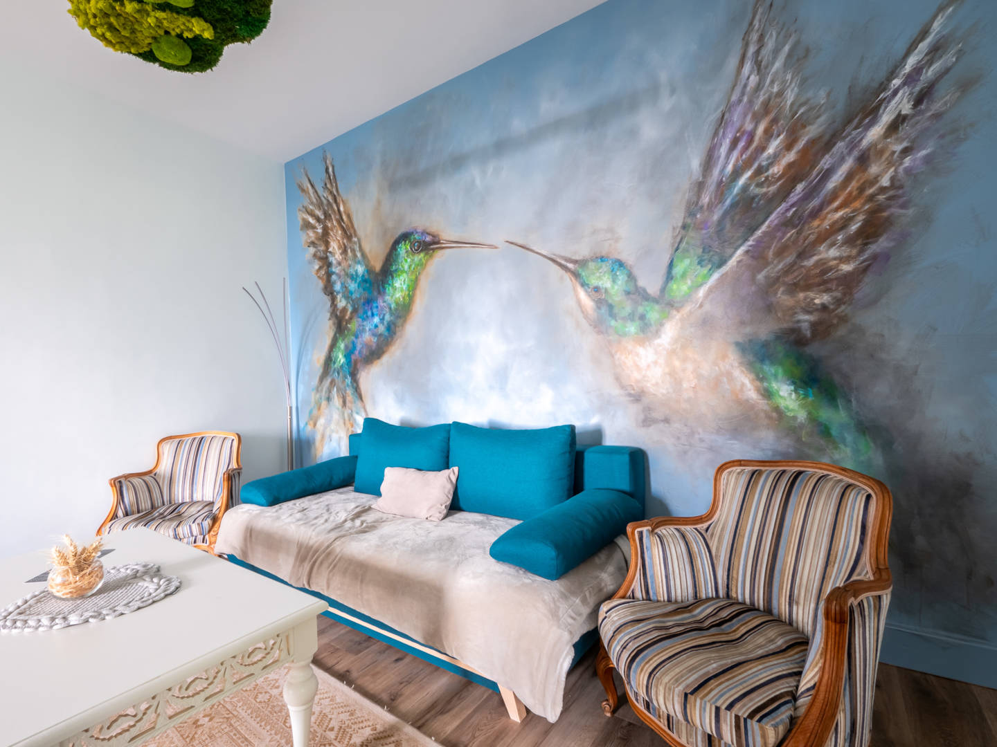 Bienvenue dans le paradis des petites ailes ! La chambre « Rêve de Colibri » est un vrai cocon de douceur et de sérénité. Plongez dans une atmosphère magique, où des tons bleus et des touches végétales délicates vous invitent à vous poser et à respirer.
