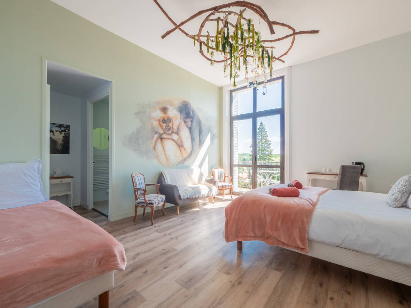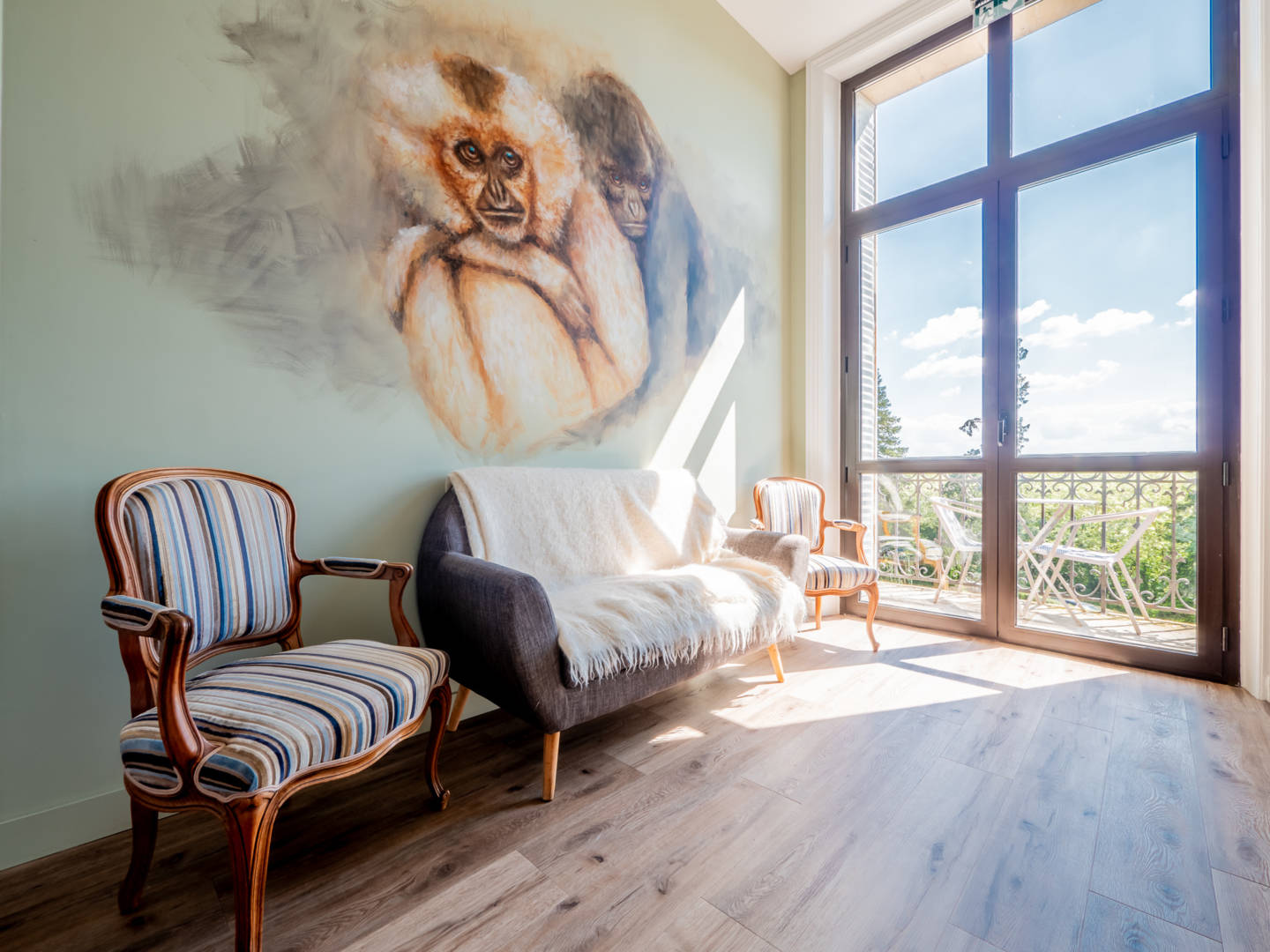 Entrez dans une bulle sauvage en vous évadant au pays des gibbons. Cette chambre spacieuse, aux couleurs éclatantes, vous transporte directement dans les forêts tropicales d’Asie !