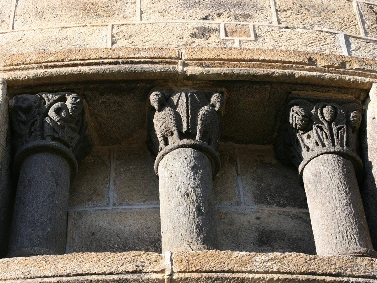 La travée droite est percée d’une porte dont le linteau est en bâtière comme souvent en Basse-Auvergne (Notre-Dame-du-Port à Clermont-Ferrand, Notre-Dame du Mont-Cornadore à Saint-Nectaire) et dont le tympan est orné d’une mosaïque de pierres.