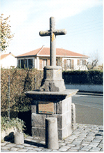Croix de carrefour, dernier vestige de l’emplacement d’une chapelle démolie. Une face du croisillon de la croix présente le Christ et son revers la Vierge.