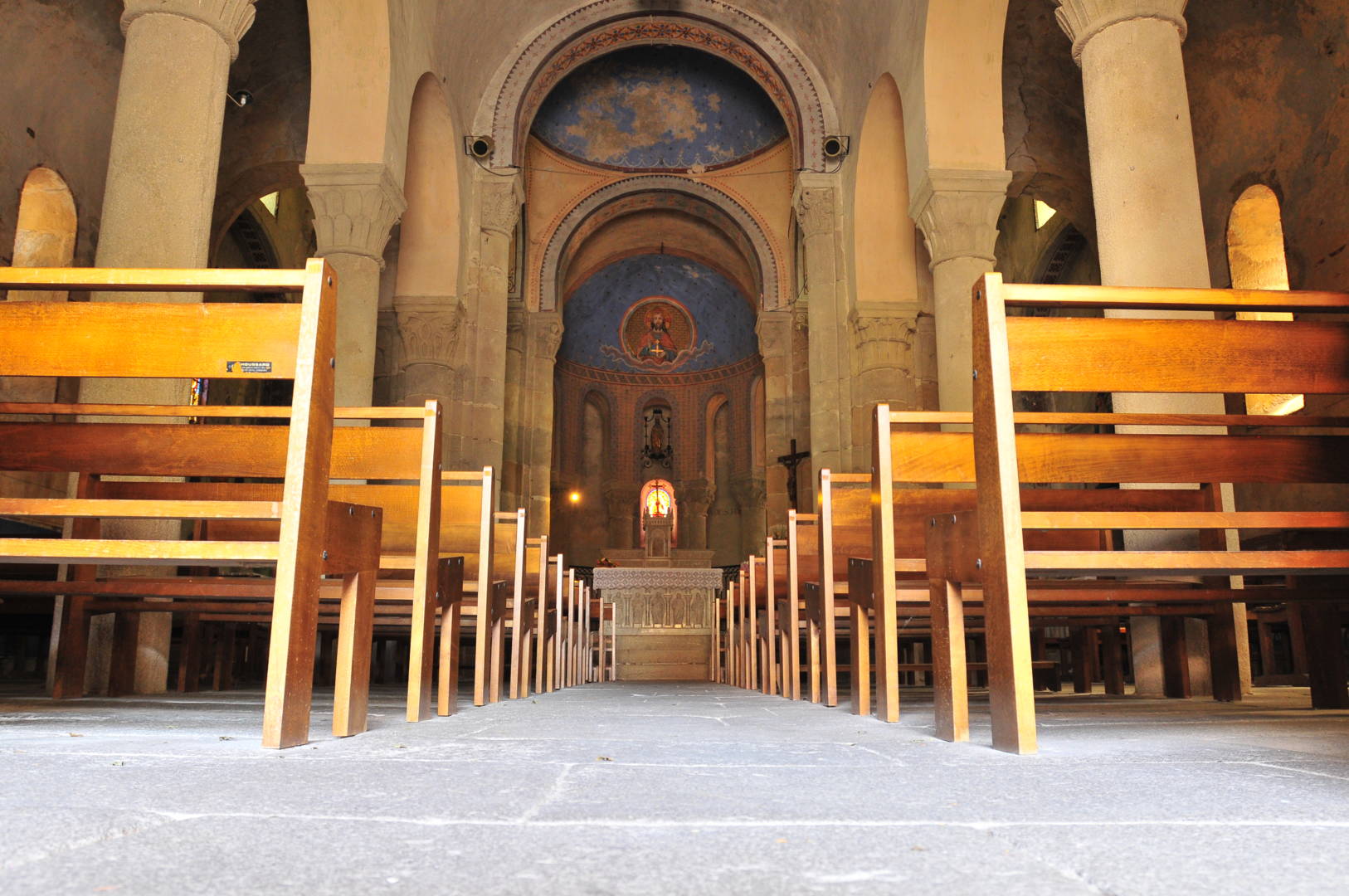 On retrouve ainsi les caractéristiques suivantes : nef confortée de bas-côtés, prolongée d’un déambulatoire entourant le chœur. Des colonnes, monolithes ou à tambours, supportent la voûte. Les chapiteaux figurés du chœur, d’inspiration romane, illustrent la virtuosité des tailleurs de pierre du 19e siècle. Bel ensemble de vitraux, en partie datés(…)
