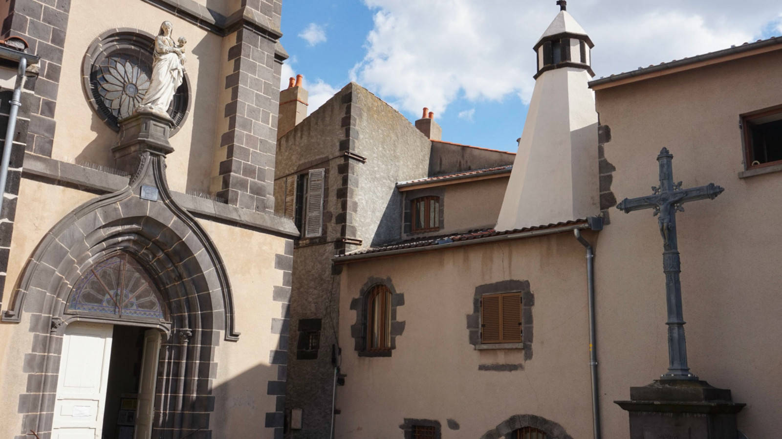 Son plan irrégulier, modifié au cours des siècles, est basé sur le modèle des églises halles : voûtes de la nef et des collatéraux au même niveau. Ce plan s’inspire de modèles du Limousin ou du Poitou, en lien avec l’Aquitaine, connus dès la seconde moitié du 12e siècle. La nef longue de 4 travées est composée d’un collatéral au sud et d’un bas-côté et de chapelles au nord. Elle se termine par un chevet plat. L’église conserve des baies romanes, des cordons de billettes et des contreforts en mélange d’arkose et d’andésite. Ces éléments sont les vestiges d’un édifice roman de la seconde moitié du 12e siècle. Ce sanctuaire est entièrement reconstruit dans les années 1200. Les chapiteaux de l’église pourraient alors être datés des années 1200-1220. Des éléments de l’ancien cloître sont visibles dans le passage longeant la sacristie. L’ensemble est très restauré en 1860.