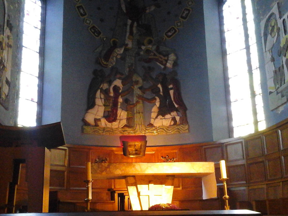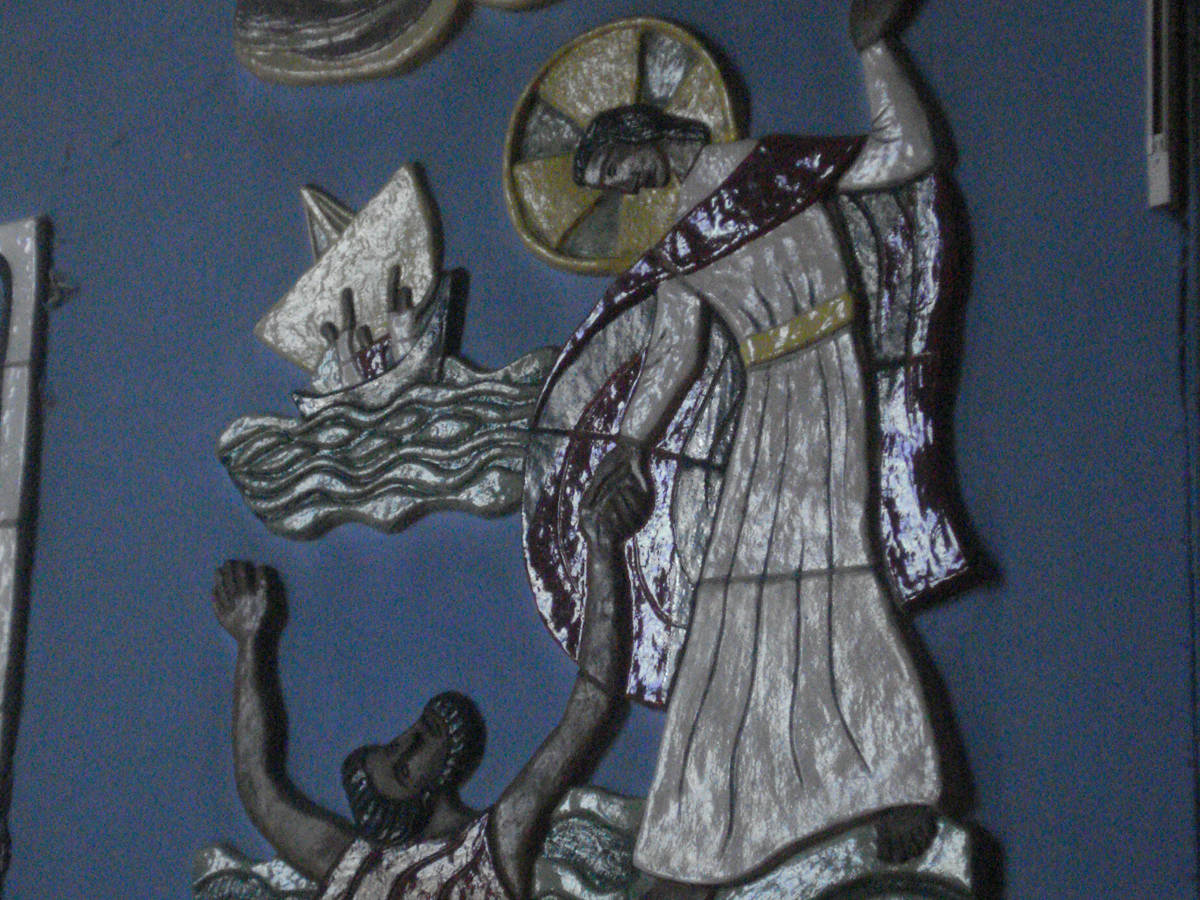 Elle est dédiée à Saint Pardoux à qui la croyance populaire attribue de nombreuses guérisons miraculeuses de paralytiques à l’aide des sources, ce qui explique la présence de son culte au Mont-Dore. Une statue du saint se situe à la droite de l’entrée Cette église est atypique car ni son plan et son orientation ne sont fidèles à la tradition. En effet, elle ne présente pas l’habituelle forme de croix, et elle est orientée au Nord quand la tradition la voudrait tournée vers l’Est. Mais la véritable originalité de cette église se trouve dans la modernité et la qualité de sa décoration intérieure développée sur le thème de l’eau. Le chœur décoré par Jean Olin (1894-1972), dont les murs sont peints en bleu et ornés de céramiques aux motifs modernes évoquant le thème biblique de l’eau vive. La réalisation comprend six scènes du Nouveau Testament et une scène de l’Ancien Testament. Vous remarquerez également la présence des douze signes du zodiaque entourant les personnages de la principale céramique placée dans l’axe de la nef. Les vitraux de la nef, réalisés par le maitre verrier Jacques Dorchies sur le thème de la lumière, leurs couleurs vives et leurs volutes participent à renforcer cette atmosphère. A découvrir sur le mur déambulatoire de gauche, l’autre curiosité du lieu se trouve être le chemin de croix en laque de Byzance réalisé en 1965 par Line et Claude Malespine. Il s’agit d’une demi-douzaine de tableaux assez sombres qui résument la Passion du Christ illustrant un texte de Claudel. Une des premières réalisations d’Art Moderne en Auvergne.