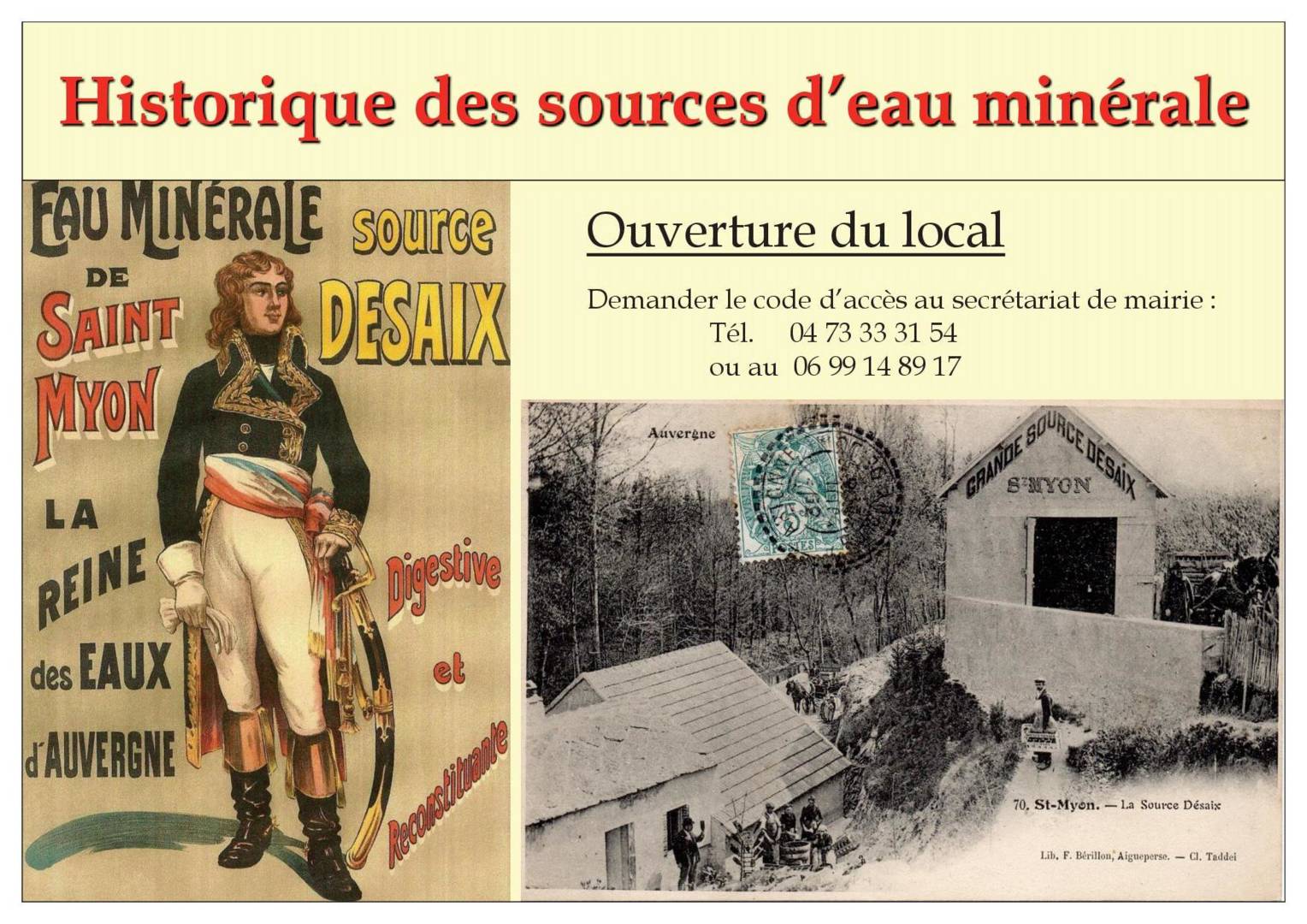 Dans le bâtiment de l’ancienne Source Desaix, au bord de la Morge, panneaux relatant l’historique de différentes sources environnantes. Objets et archives s’y rapportant.