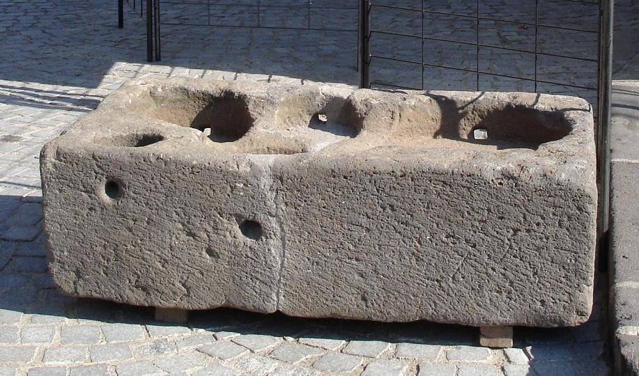 La présente pierre est un étalon qui servait à vérifier la capacité des appareils de mesures, variable d’une paroisse à l’autre. Elle comporte cinq empruntes dont les capacités sont d’environ : 0,75 litre – 1,75 litre – 2,30 litres – 17,50 litres – 56,75 litres ; le système métrique n’apparaissant qu’après la Révolution.