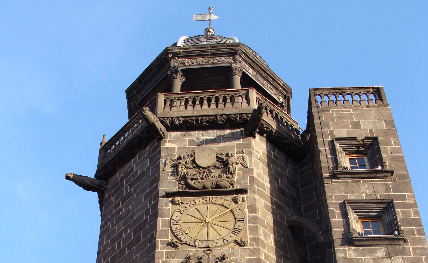 Tour octogonale avec cadran d’horloge, écusson bûché, collier de l’ordre de Saint-Michel et salamandre de François 1er. Le Dôme date de 1785.