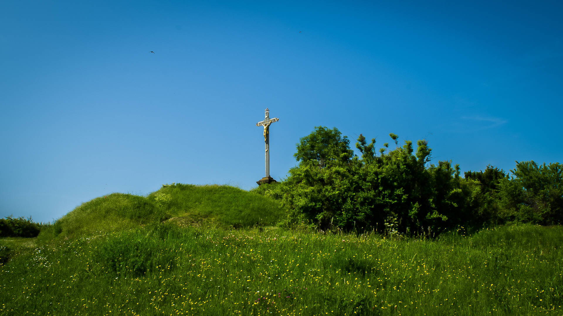 La croix du calvaire érigée en 1884 montre l’emplacement de l’ancienne forteresse du Comte Guy II.