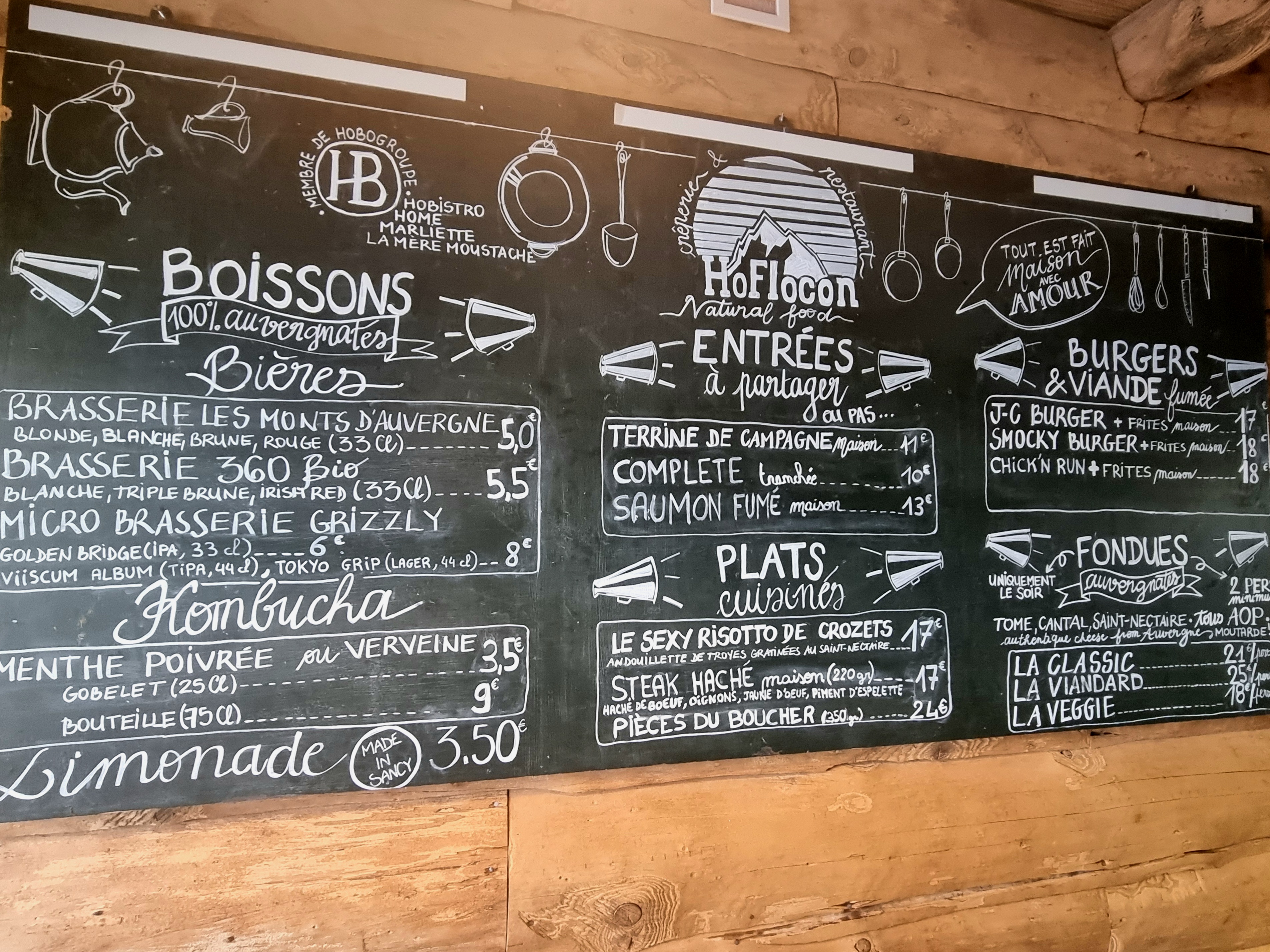 En plus des galettes, avec, entre autres, du fromage local, on trouve sur la carte, des salades, des viandes, des burgers au porc ou au bœuf, des fondues classiques ou revisitées comme l’Auvergnate ou la végétarienne… . Le tout est travaillé avec des produits locaux.